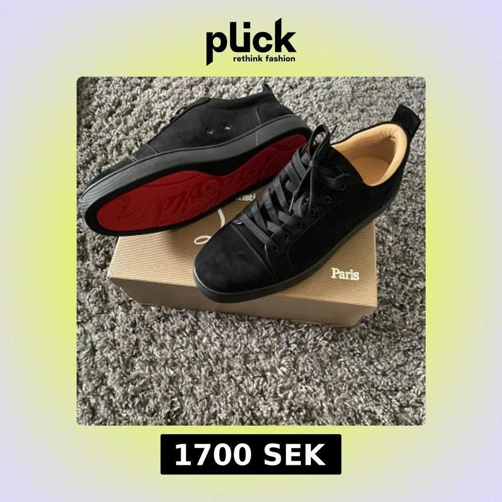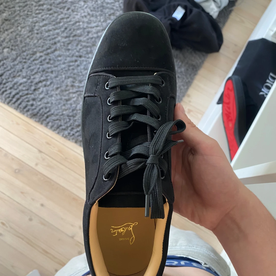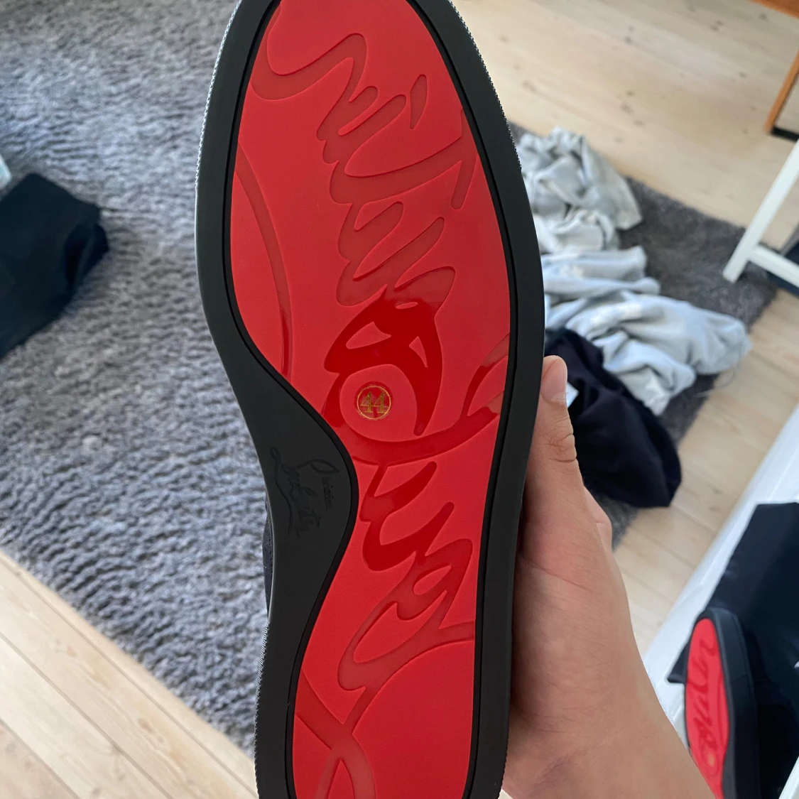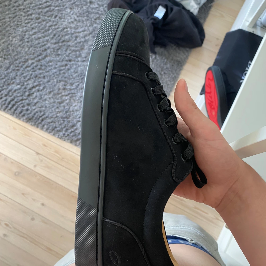 Snygga svarta sneakers från Christian Louboutin i mocka med ikonisk röd sula. Skorna har rund tå, svarta skosnören och diskreta detaljer. Insidan är beige och sulan har Louboutins signatur. Perfekta för dig som vill sticka ut med lyxig streetstyle.