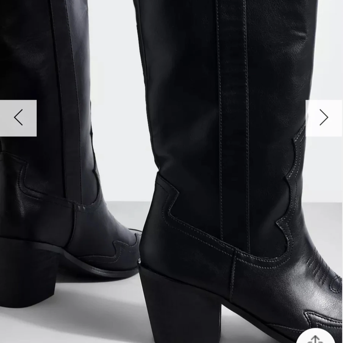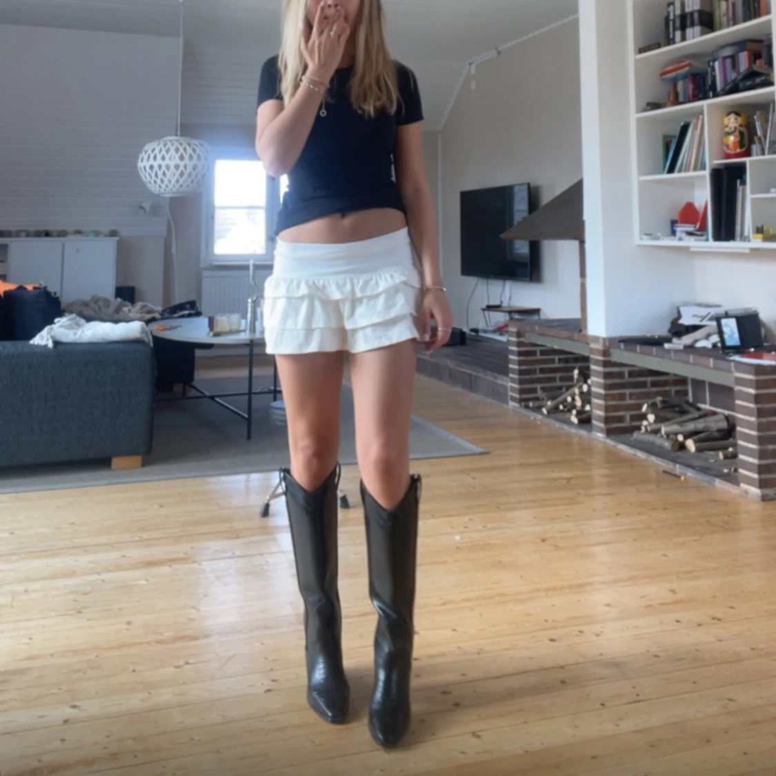 Säljer ett par svarta cowboy boots i skinnimitation med markerad klack och klassiska western-detaljer. Bootsens höga skaft och spetsiga tå ger en riktigt snygg siluett. Perfekta att styla med kjol eller jeans för en trendig look.