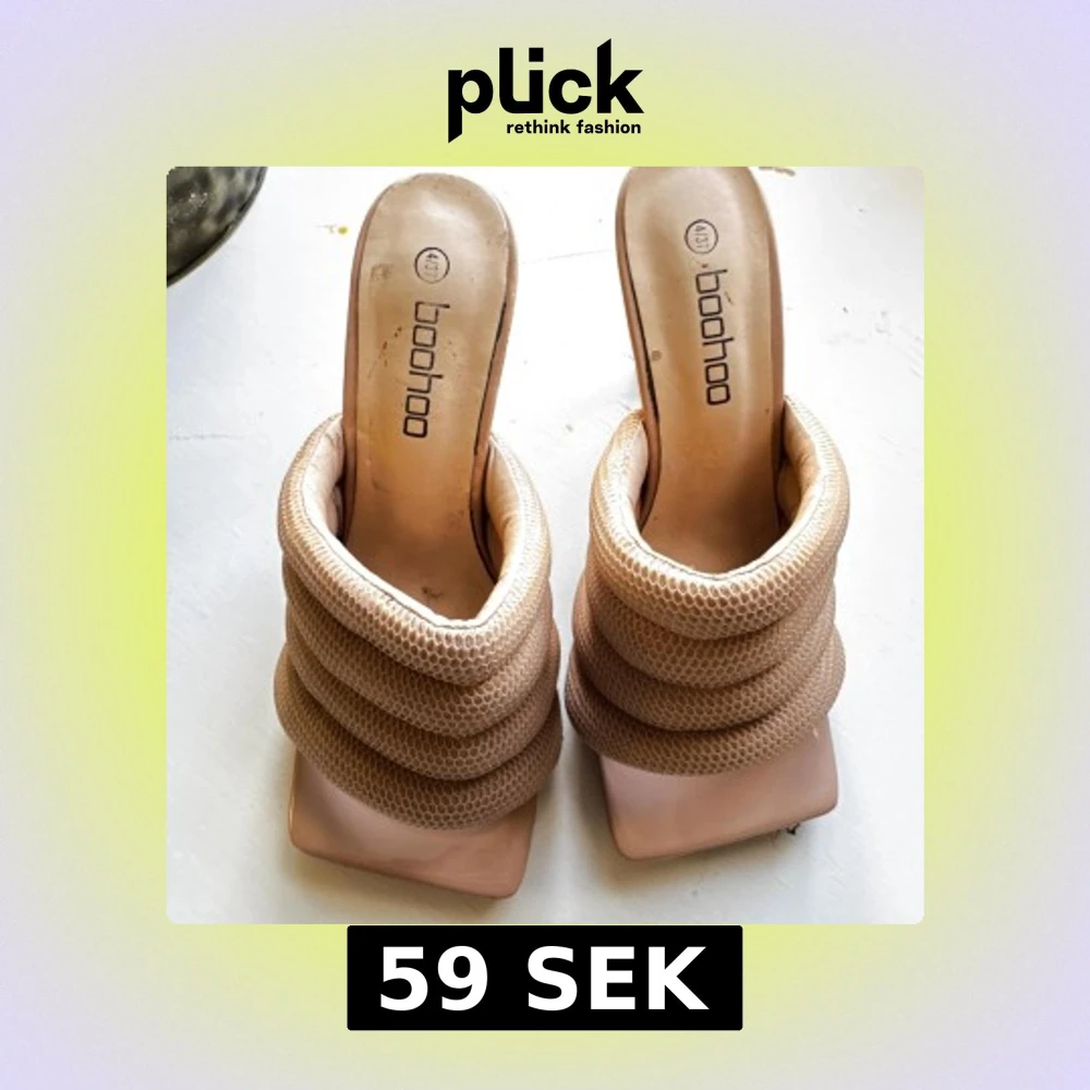 Säljer ett par trendiga beige klackskor från Boohoo med fyrkantig tå och vadderad ovandel i mesh. Skorna har hög klack och öppen tå, vilket ger en modern och edgy look. Perfekta för dig som vill sticka ut med en cool och bekväm stil. OBS: Det finns märker av användning, inte synliga när man använder skorna.