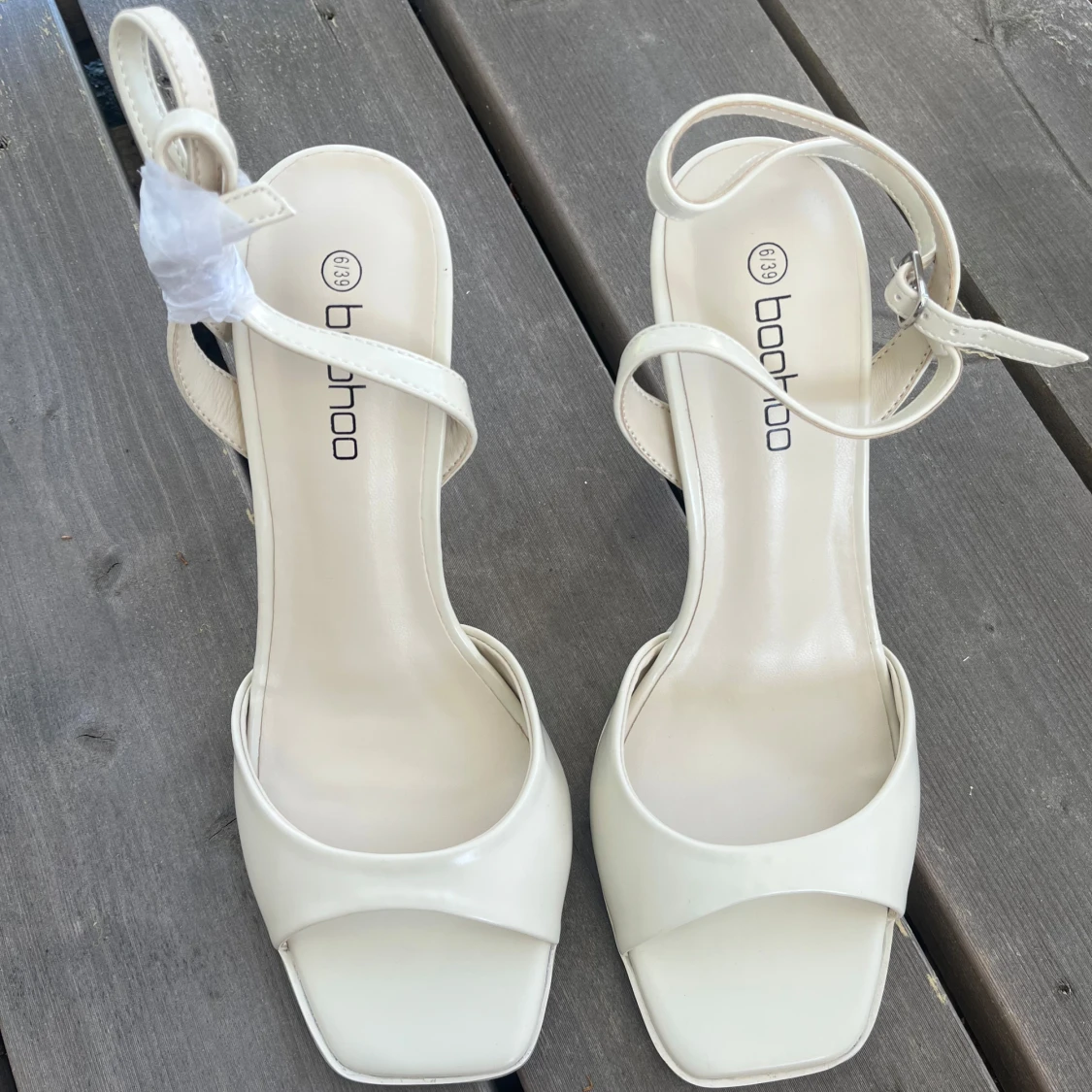 Snygga krämvita sandaler från Boohoo med hög klack och fyrkantig tå 💕. Helt ny köpta, endast vänster klack provad. Klack höjd: ca. 10cm. Har utbytbara knoppar under klacken som kan bytas ut (bild)