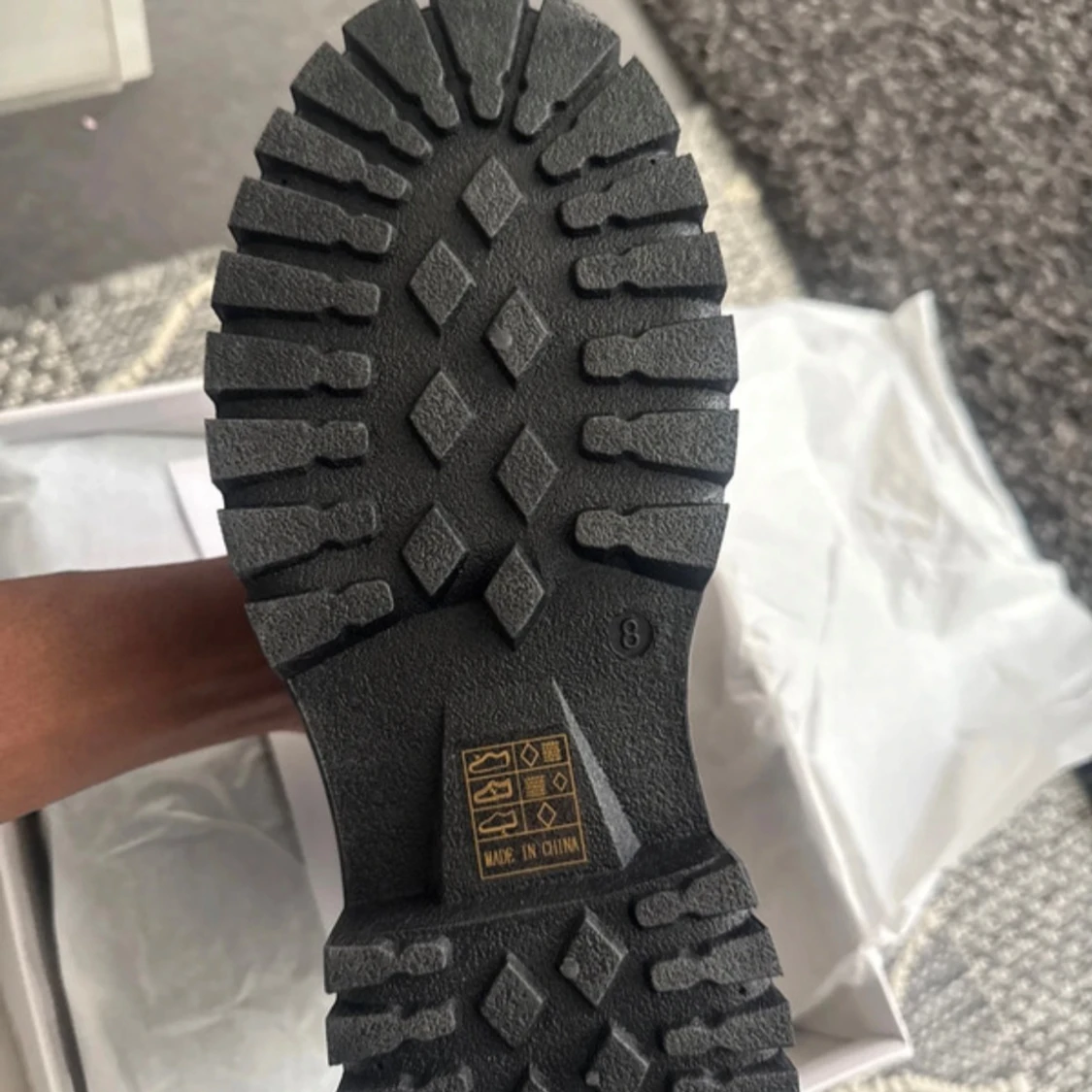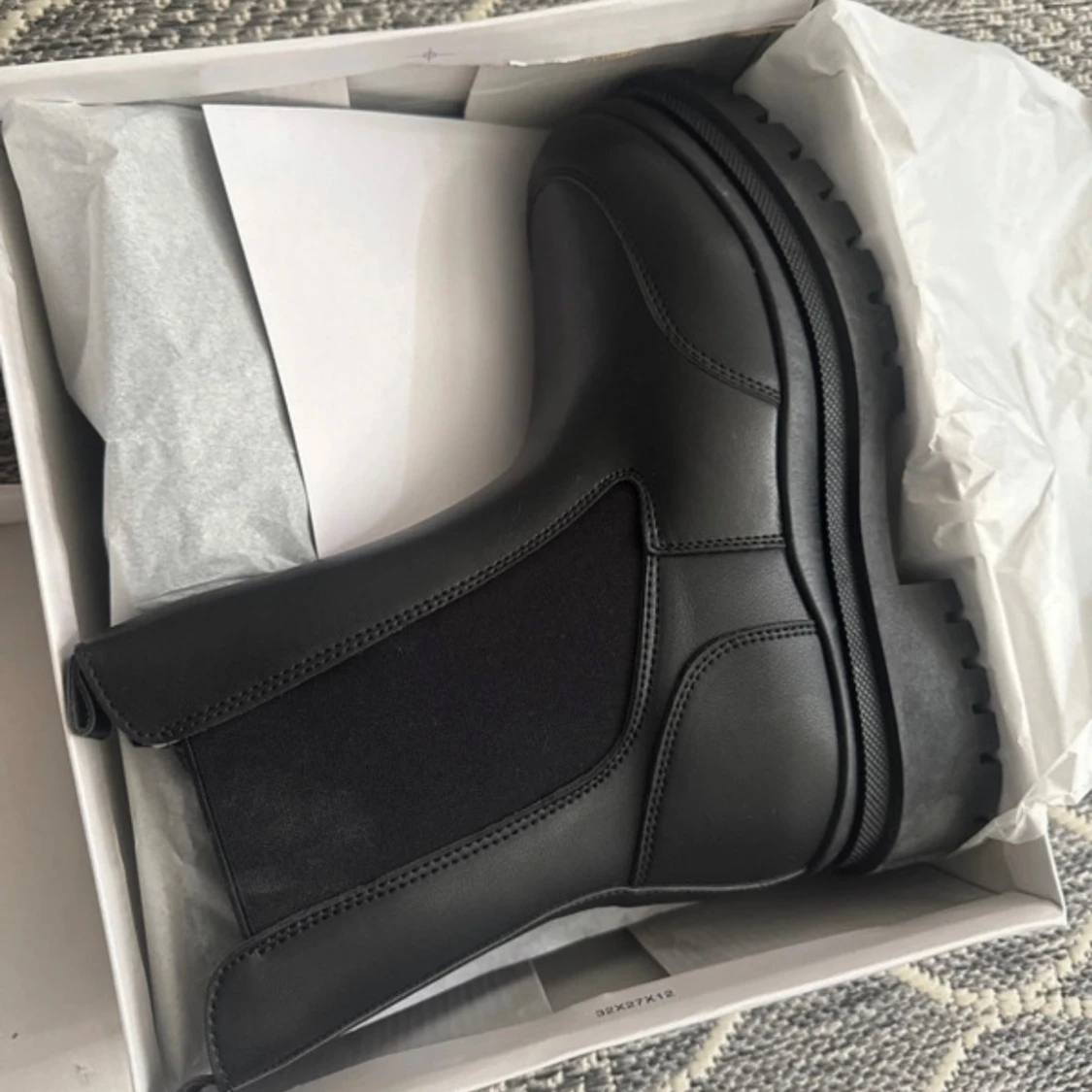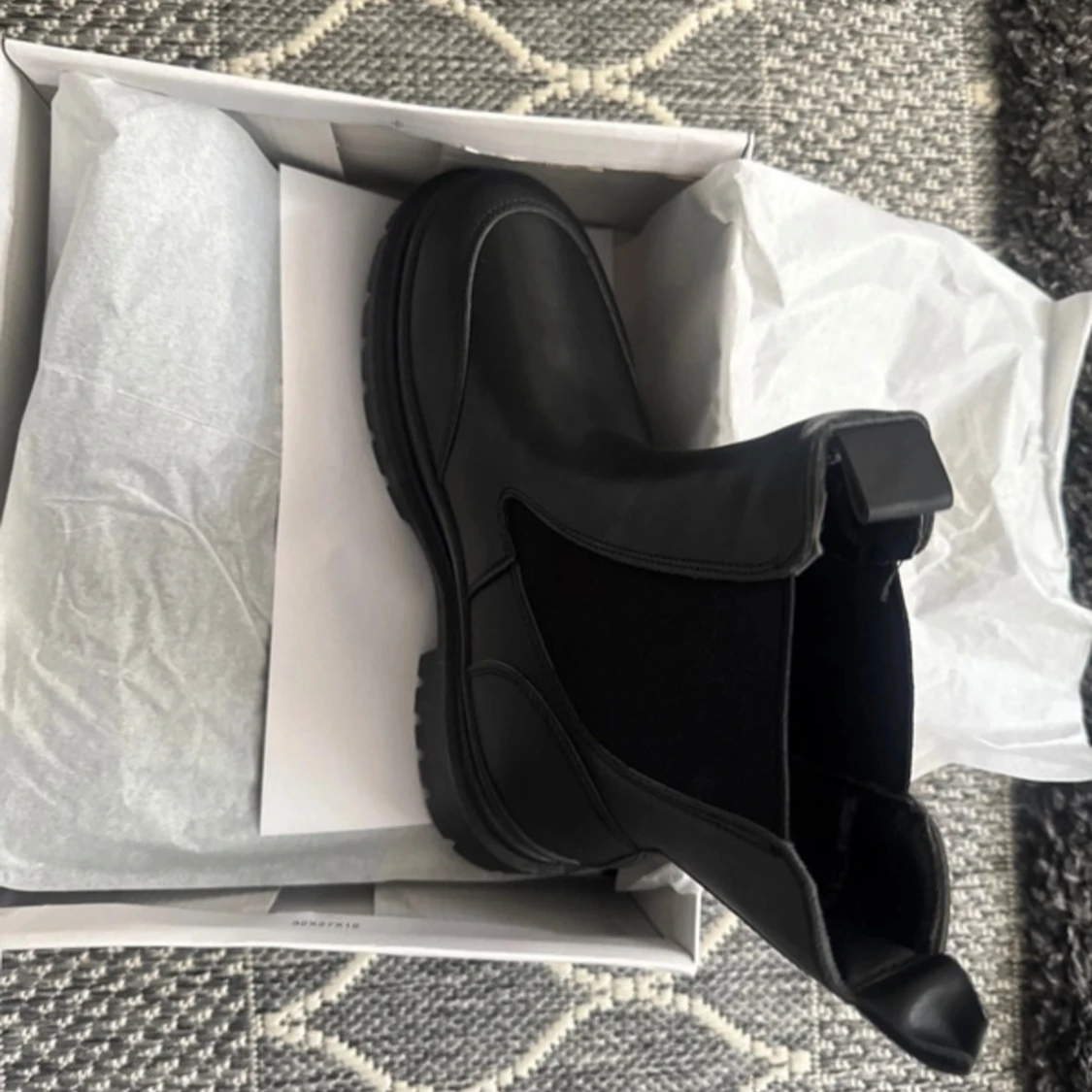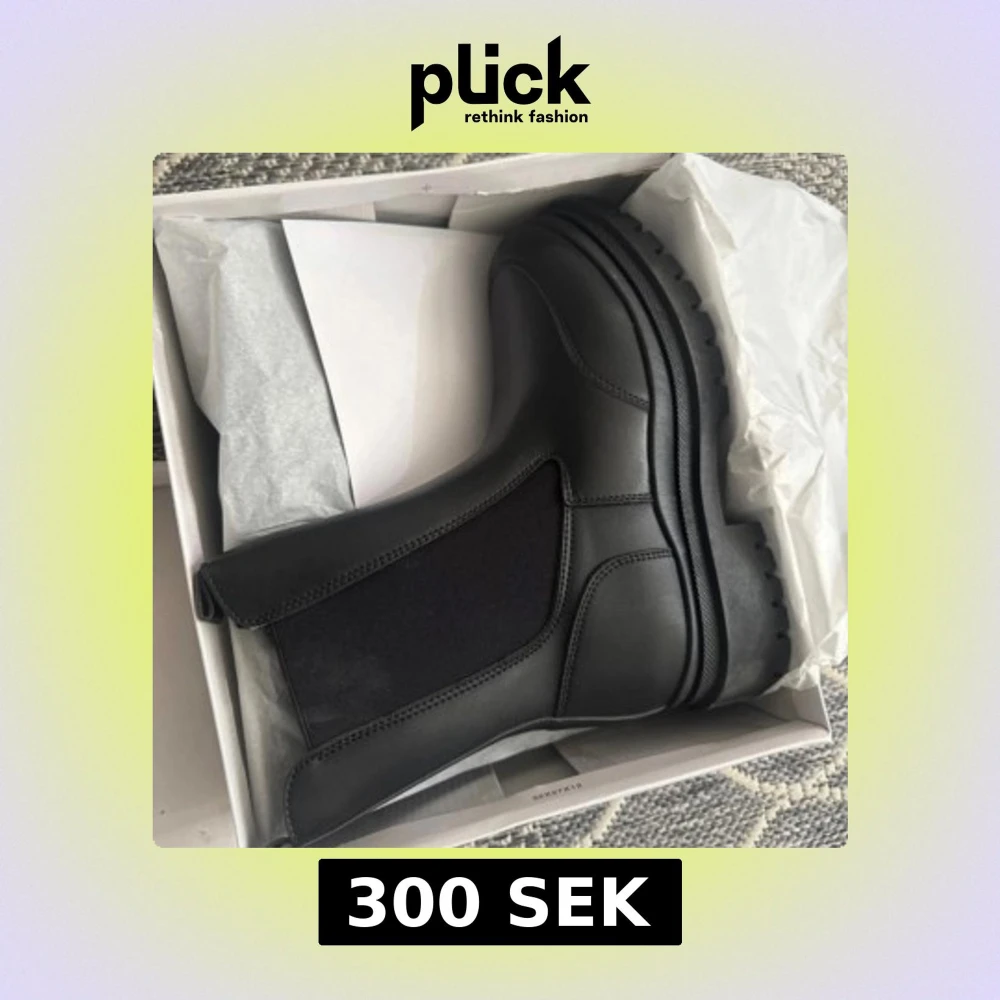Säljer ett par svarta chelsea boots med chunky, mönstrad sula och elastiska paneler på sidorna. Bootsens ovandel är i slätt syntetmaterial och har en rund tå. Perfekt för dig som gillar stilrena och robusta skor med edge.