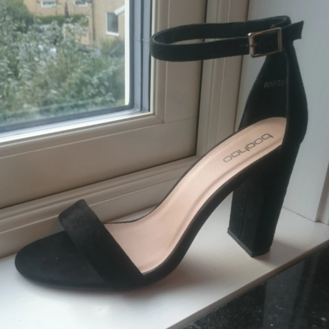 Snygga klackar i mockaimitation (tror jag) från Boohoo med band med silverspänne runt vristen. Bara använda kort inomhus men jag fixar tyvärr inte höjden på dem (10 cm) haha så jag måste tyvärr sälja!
