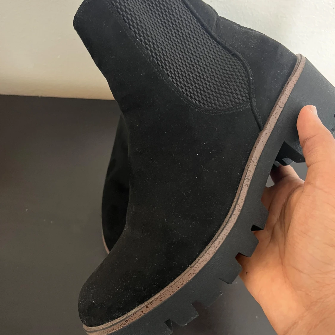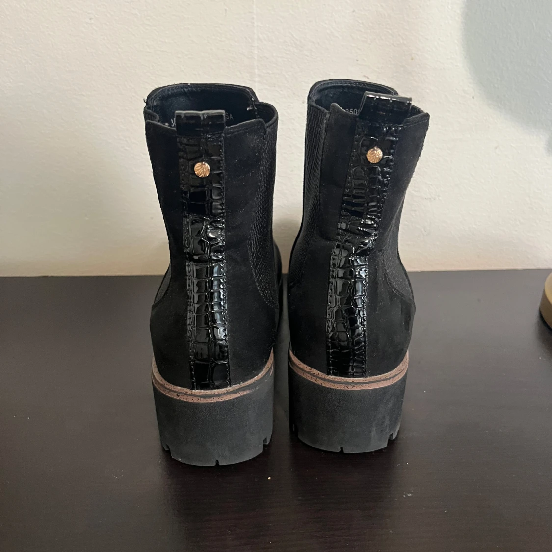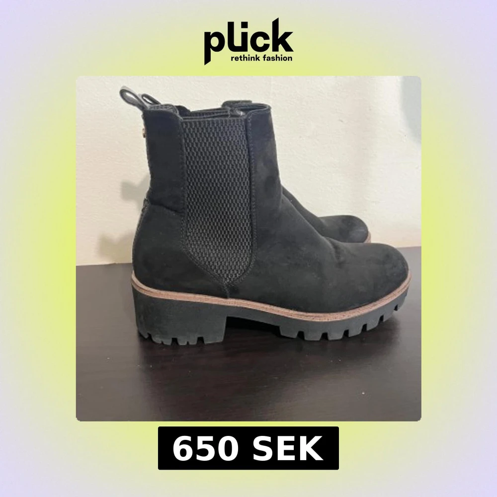 Snygga svarta chelsea boots i mocka med grov sula och platt klack. Resår på sidorna och detaljer i blankt, krokopräglat material baktill. Perfekta för höst och vinter när du vill ha både stil och komfort.
