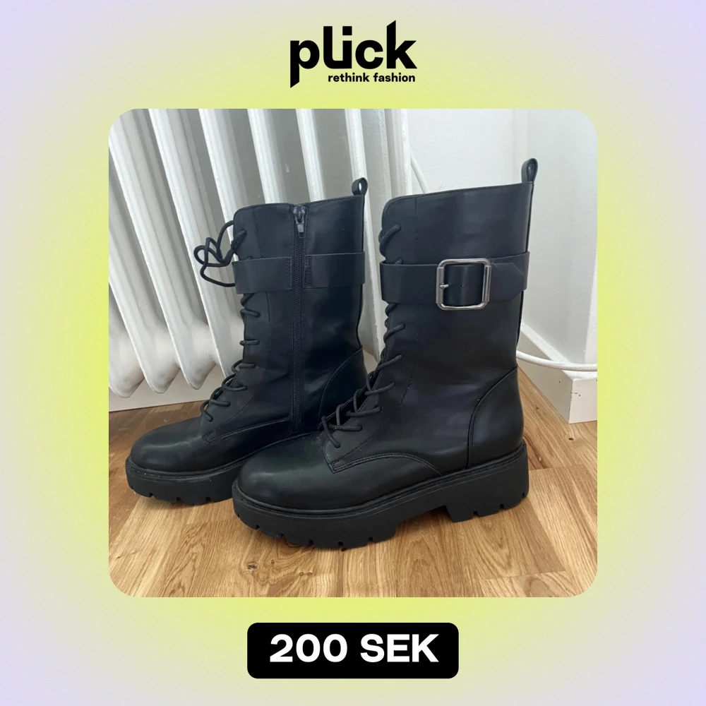 Snygga svarta boots med spänne och snörning. Plattformssula. Är använd max 1-2 gånger som ni kan se på sulan. Perfekt nu till höst och vintern 🍂