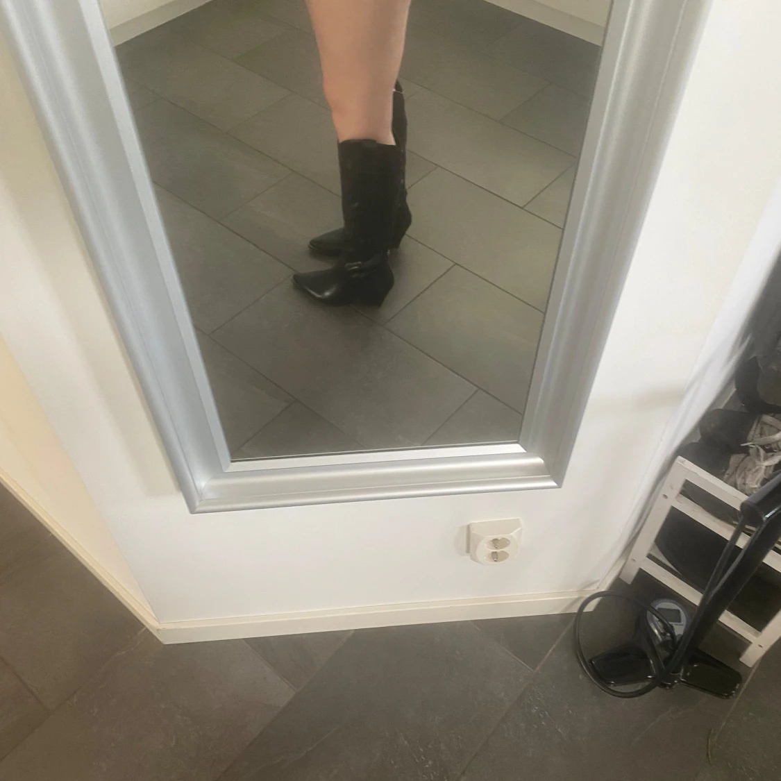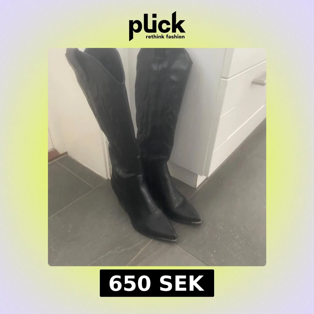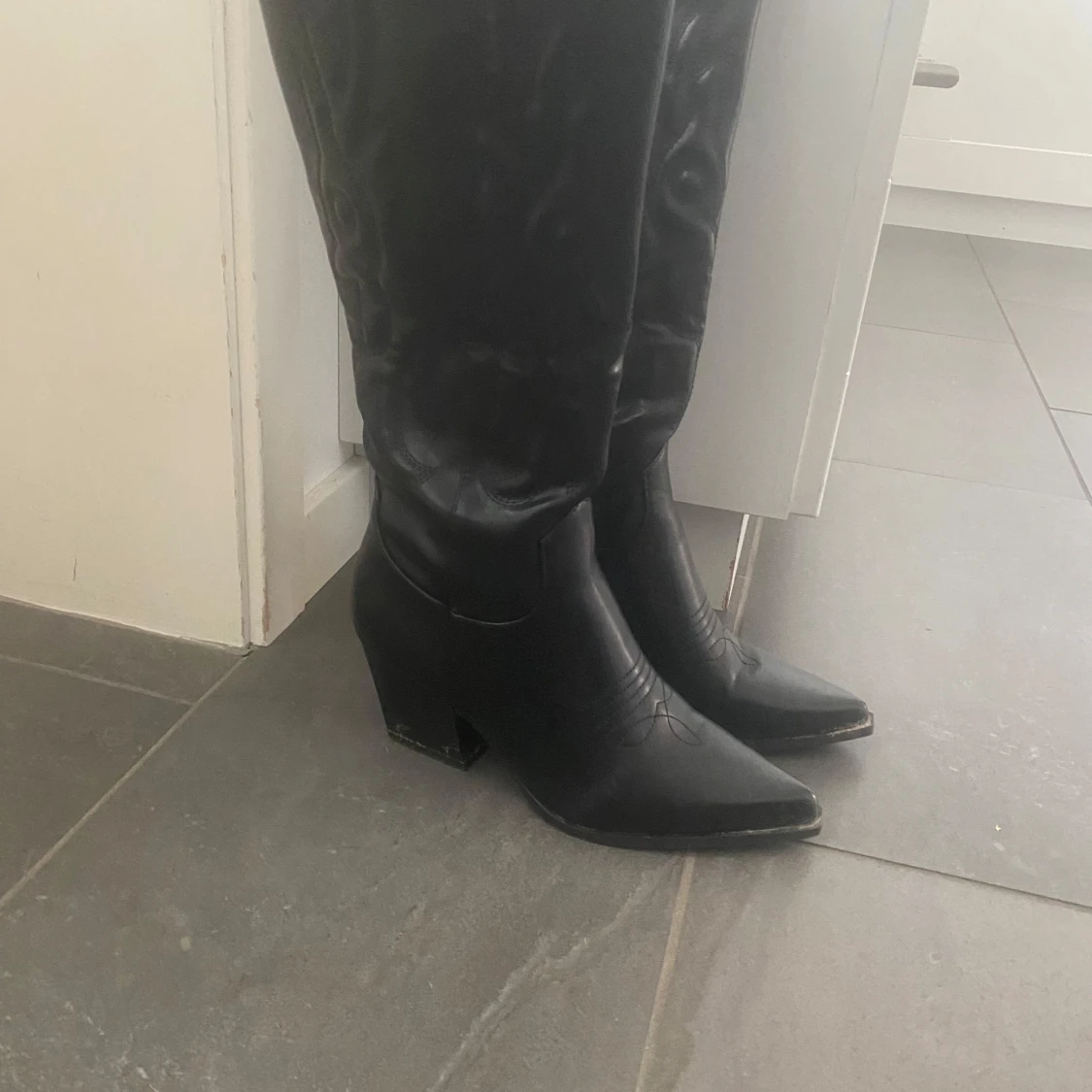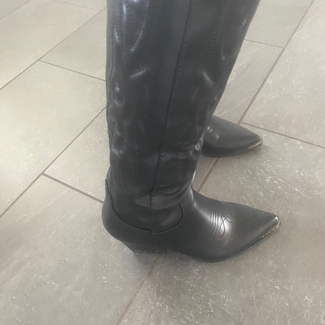 Jättefina svarta cowboy boots i skinn med spetsig tå och markerad klack. Klassisk western-design med dekorativa sömmar på skaftet och framtill. Storlek 40 men själv tycker dom är lite stora. Original pris 700kr. Använda en gång.🩷
