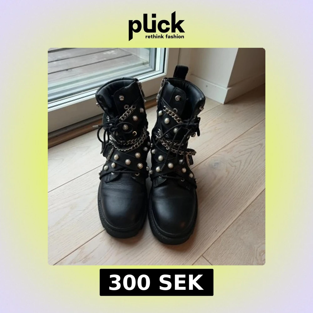 Säljer ett par svarta boots från Zara. Skorna har kedjor och pärlnitar som detaljer. Skorna är använda men är i väldigt gott skick. Nypris: 1000kr🩷