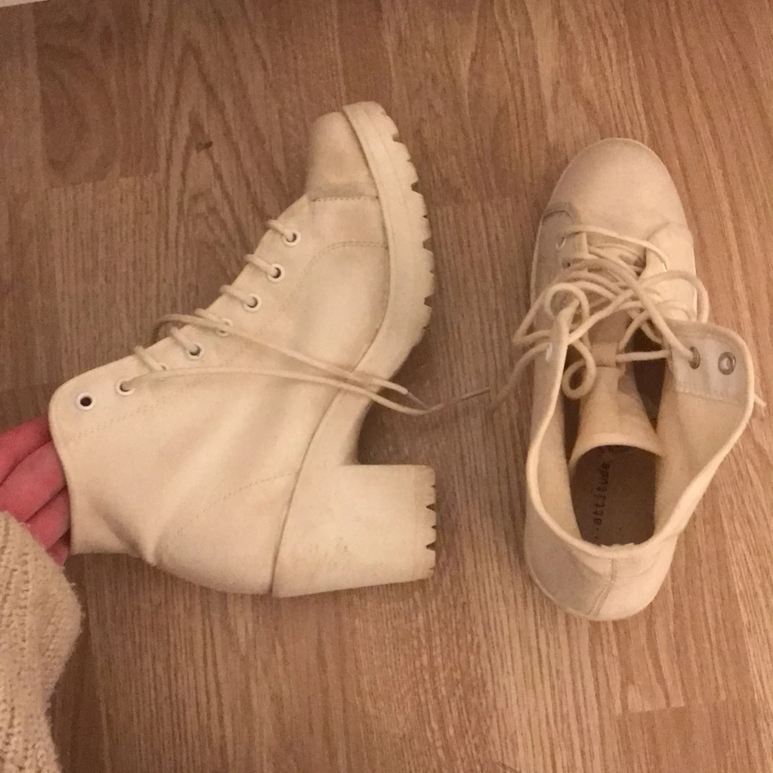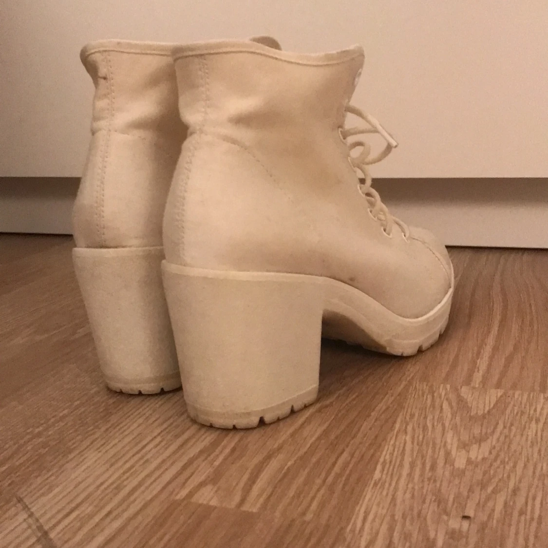 Beige-vita klackar med snörning. I och med den ljusa färgen finns det lättare missfärgningar i tyget, men inget extremt eller som man ser vid användning av dem. Skon i sig är i gott skick och bekväma att gå i💕