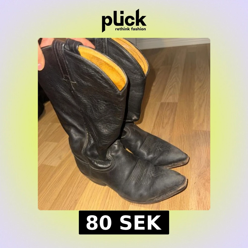 Säljer ett par klassiska svarta cowboy boots i äkta skinn med spetsig tå och låg klack. Bootsens insida är ljust brun och de har snygga broderade detaljer framtill