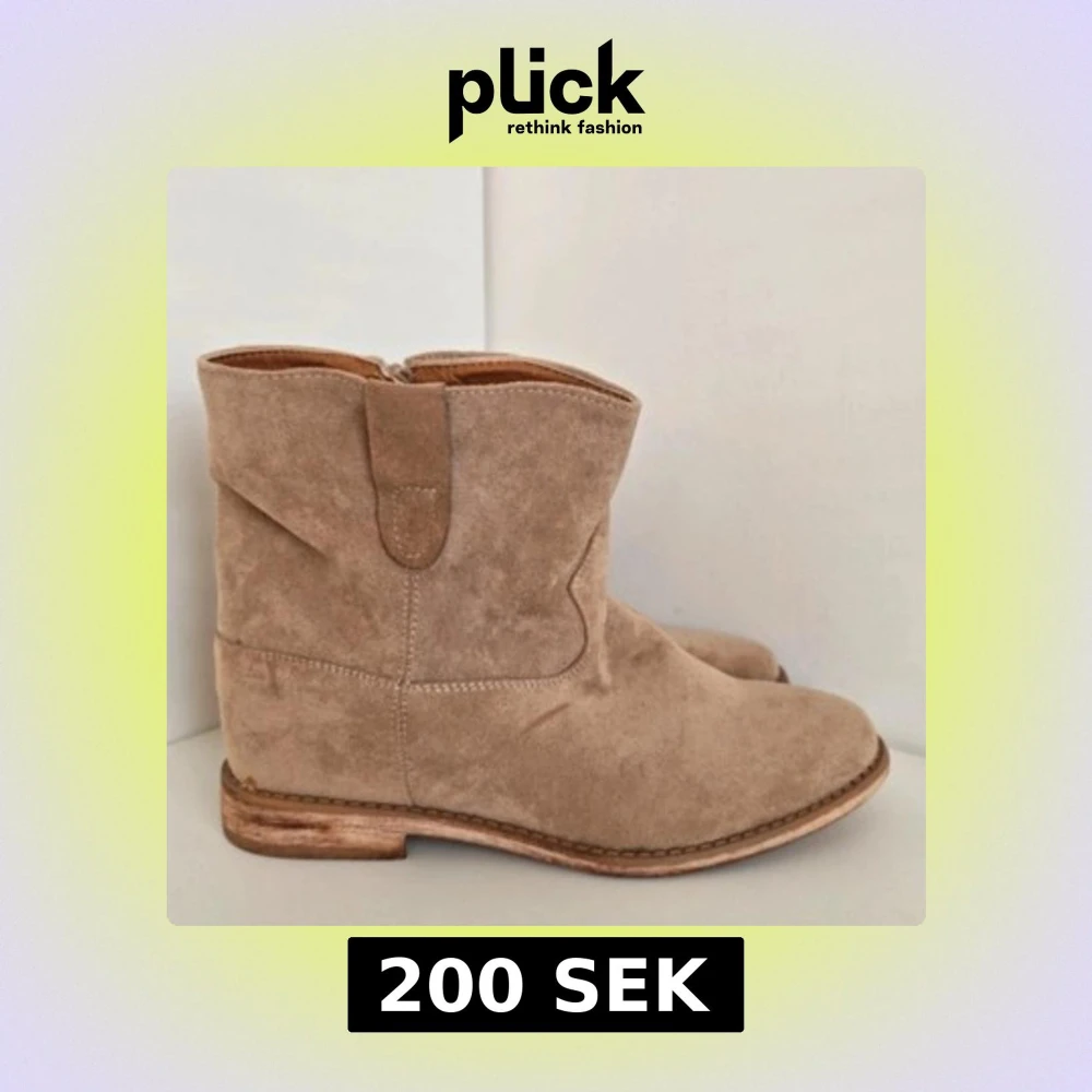 Snygga boots i beige mocka med rund tå och träfärgad sula. Skorna har dragkedja på sidan och en låg klack, vilket gör dem både stilrena och lätta att ta på. Perfekta för dig som gillar en avslappnad men trendig look.