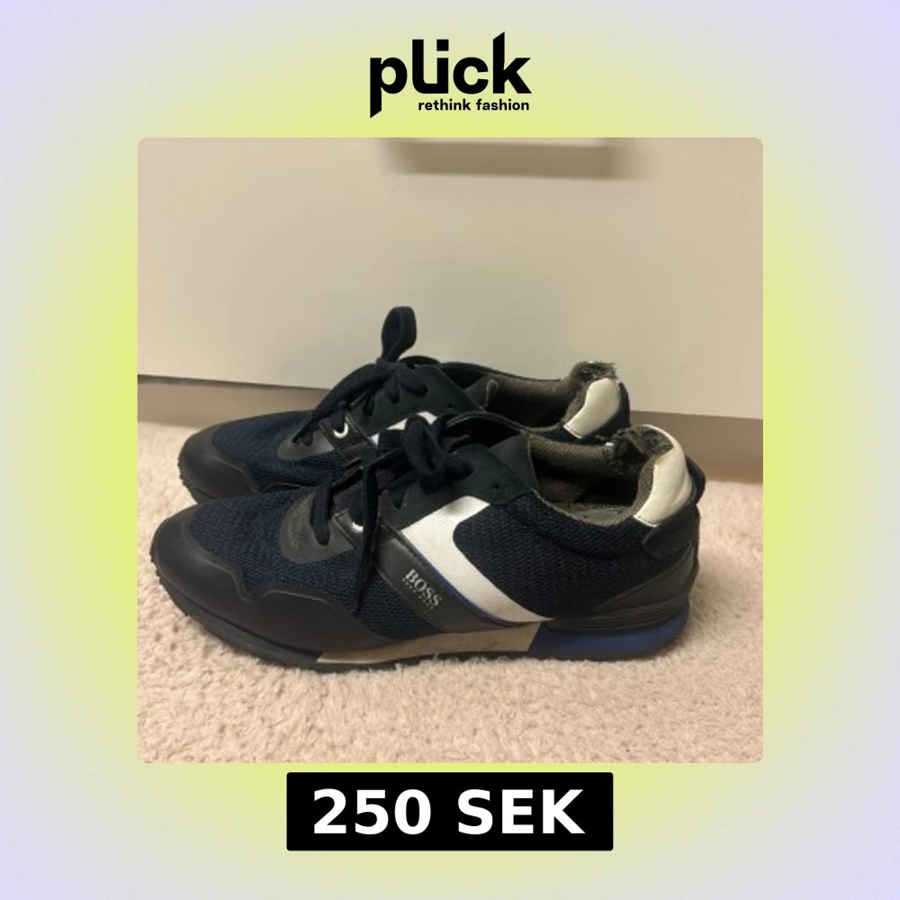Snygga svarta sneakers från BOSS med vita och blå detaljer. Skorna har snörning, rund tå och är tillverkade i en kombination av textil och syntetmaterial. Perfekta för en sportig och stilren look.