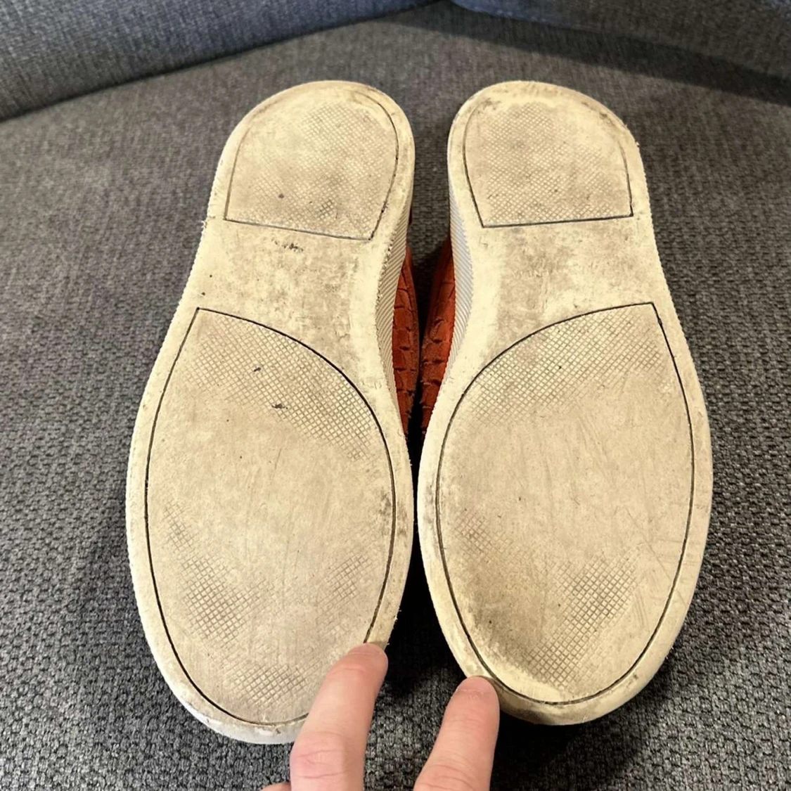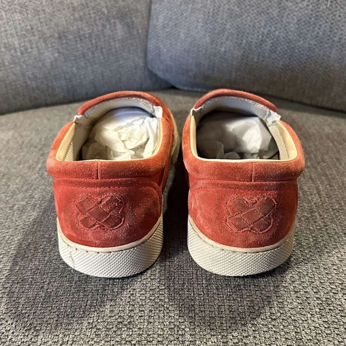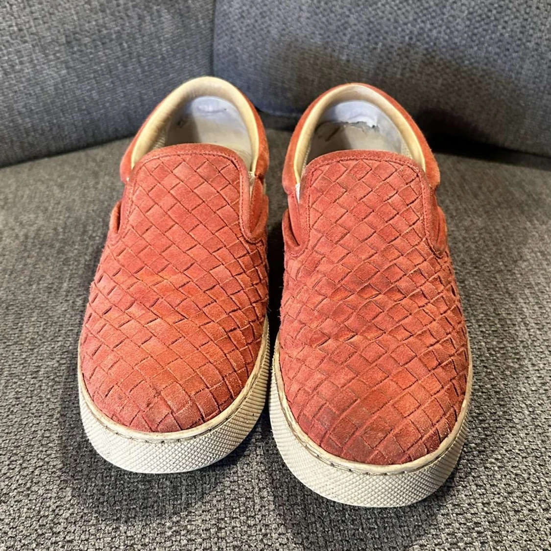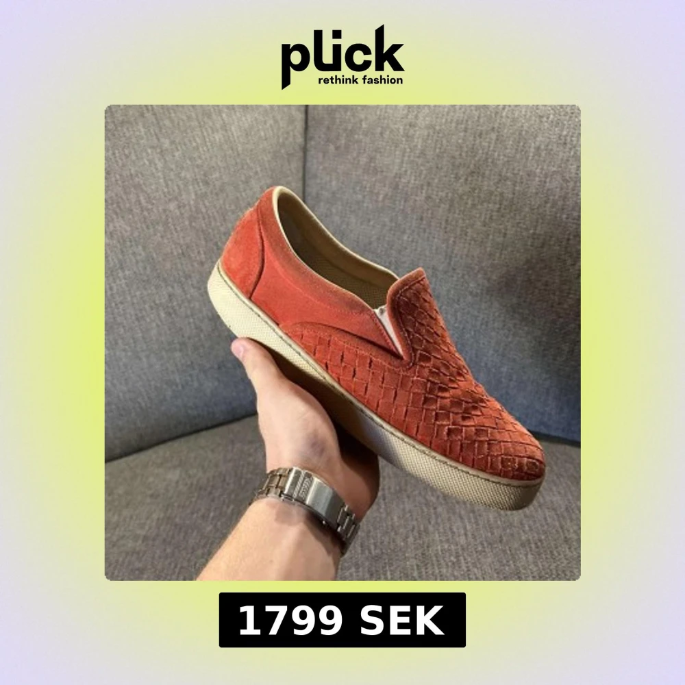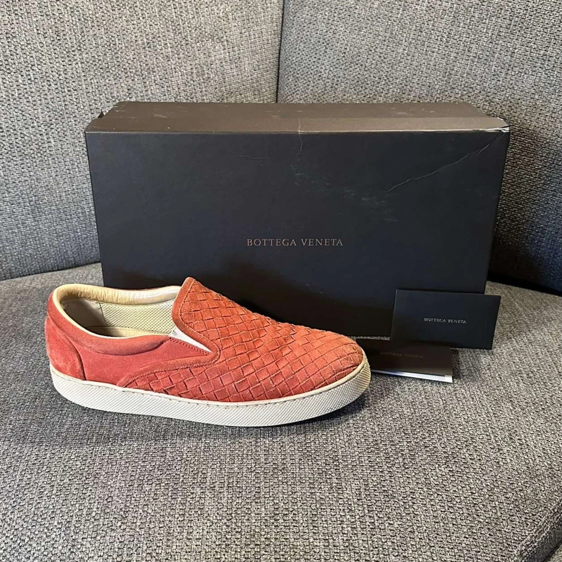 Säljer ett par röda slip-on sneakers från Bottega Veneta i lyxig mocka med deras ikoniska flätade mönster. Skorna har vit platt sula och rund tå, samt en snygg och stilren design som sticker ut. Perfekta för dig som gillar exklusiva detaljer och italiensk känsla. Priset kan diskuteras 😊