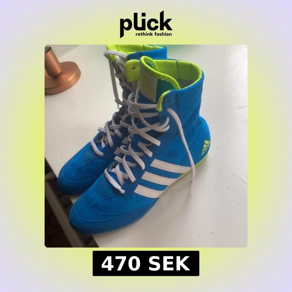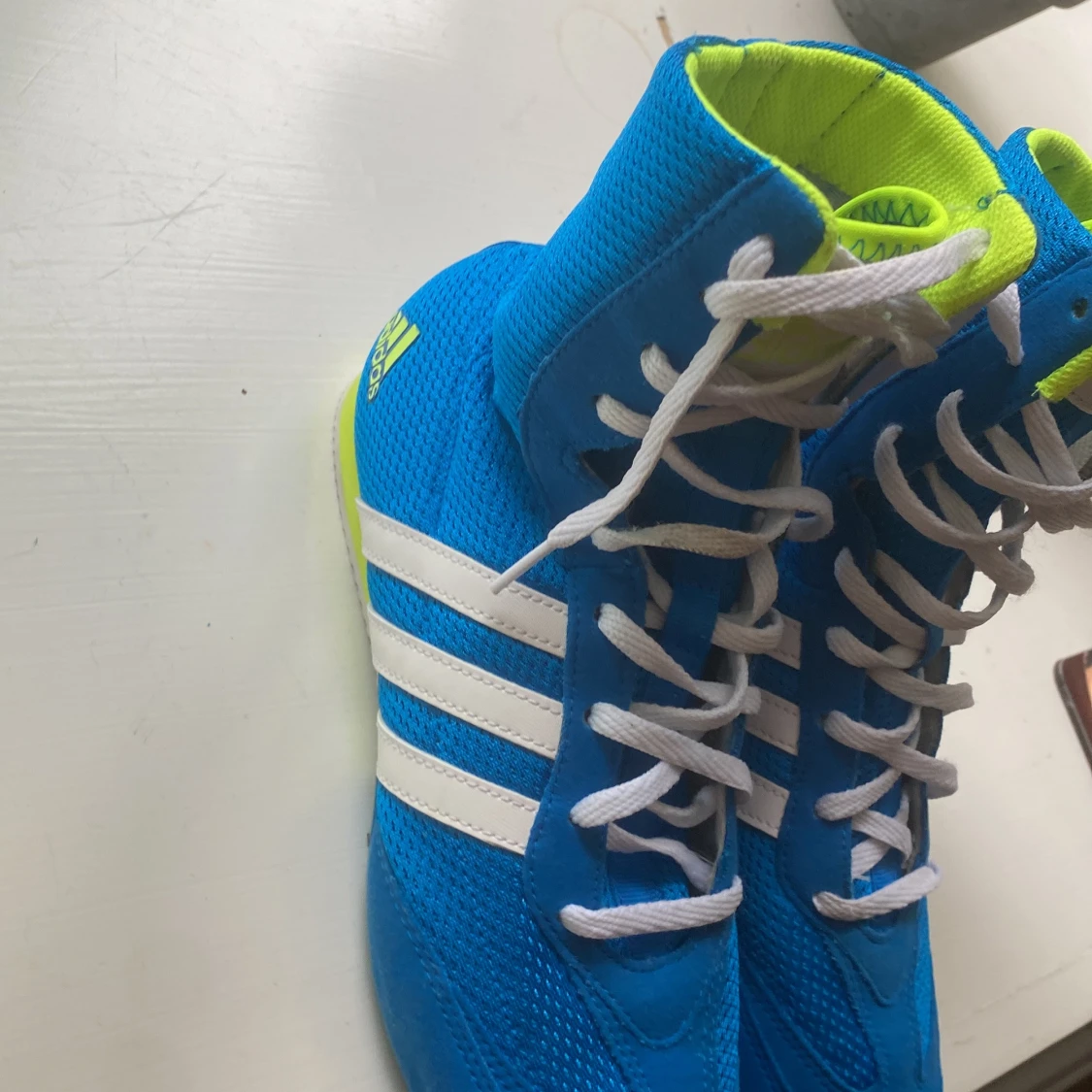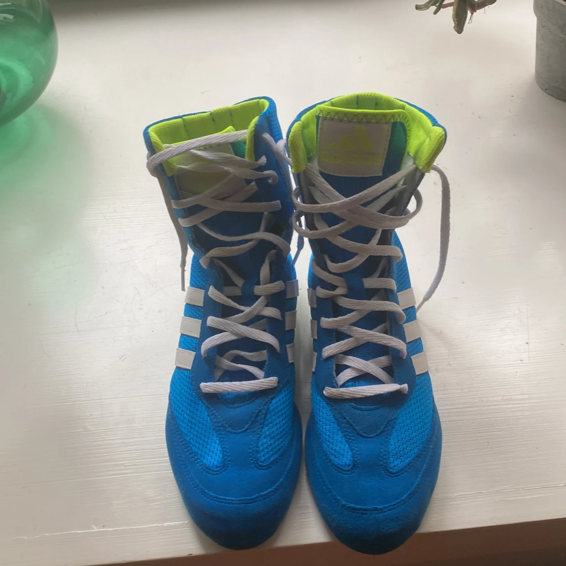 Jag säljer ett par boxnings skor från adidas,modellen är box hog 2 väldigt unik färg med blå och neongula nästan helt nya använda bara 1-3 gånger