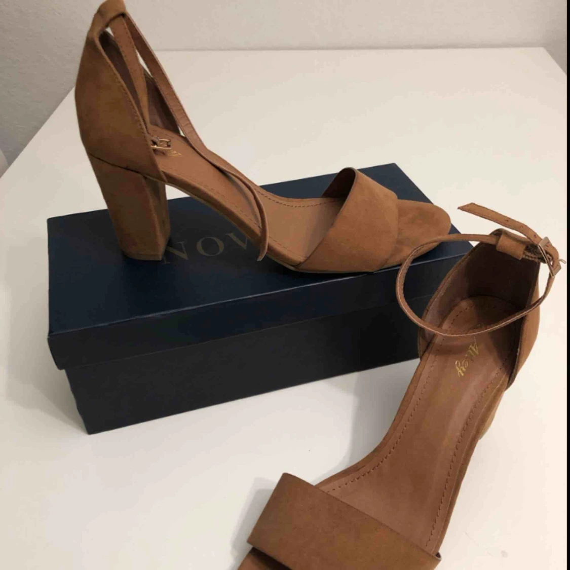 Nya, aldrig använda klackar i mockaimitation, bred klack och knäppning runt ankeln. Sköna på foten.