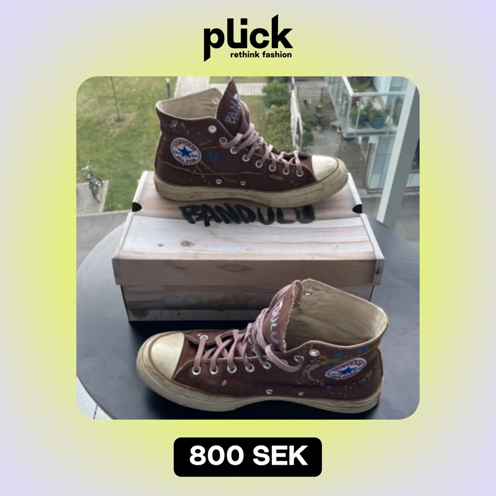 Converse collab med bandulu. Ganska sällsynt collab då de gjorde få modeller av converse. Skorna har tecken på användning men det är mest på snörena. Det tillkommer helt nya snören samt låda.