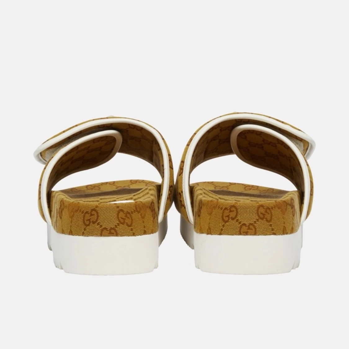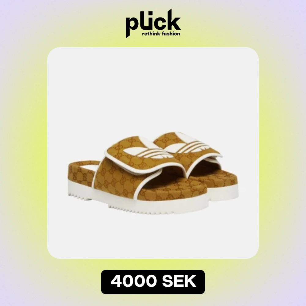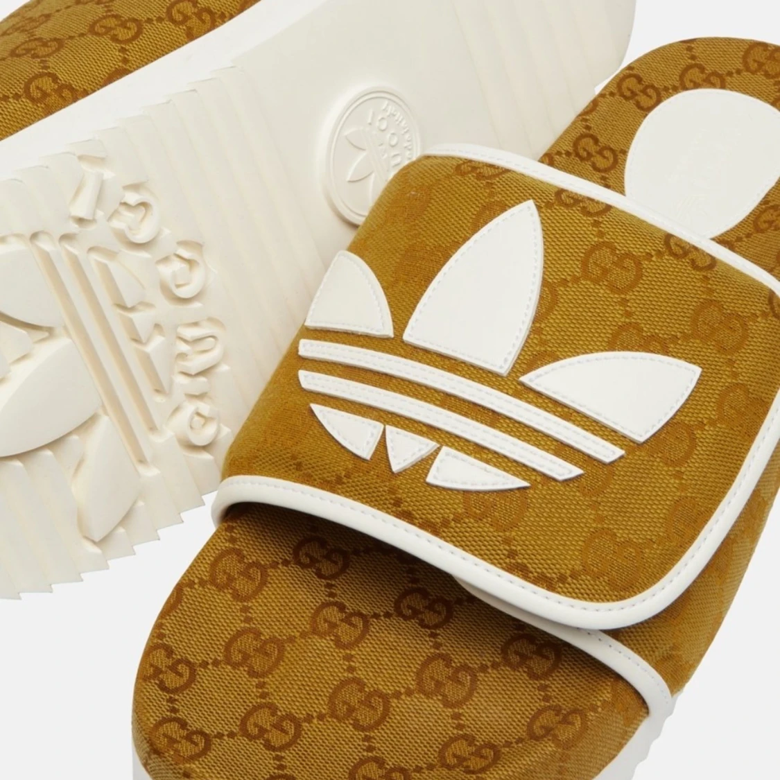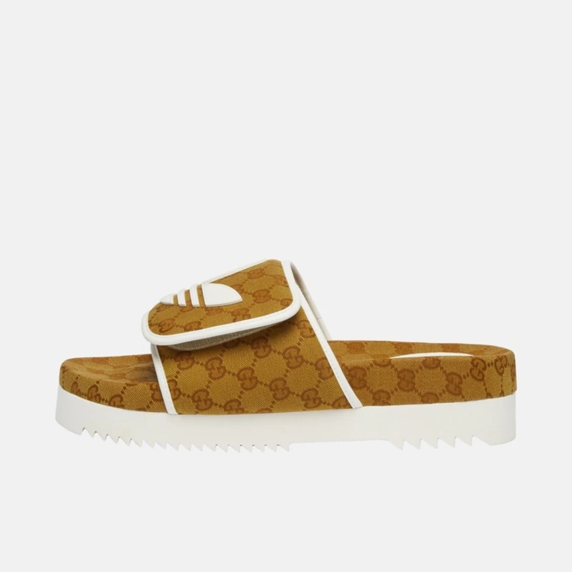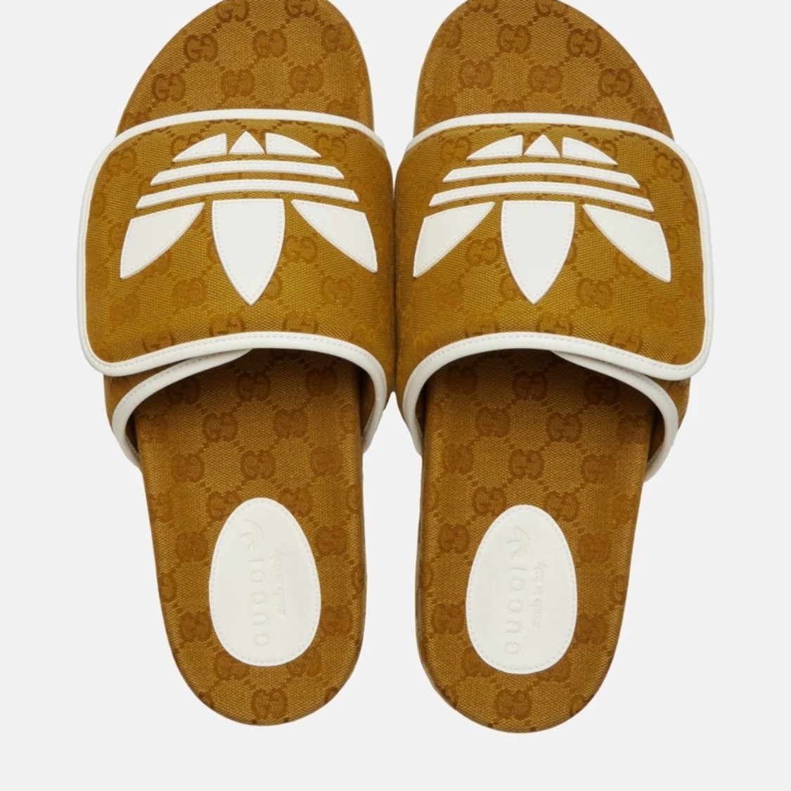Snygga bruna Gucci X Adidas sandaler. De har en cool mönstrad design och en bekväm vit sula. Perfekta för sommaren och att glida runt i stan med stil!