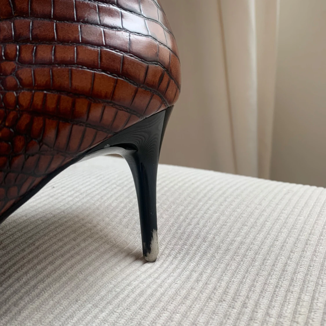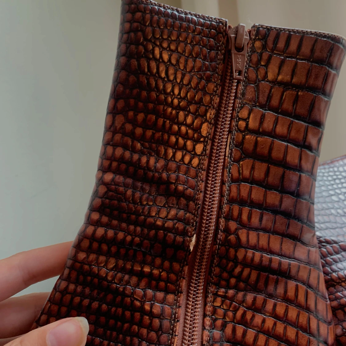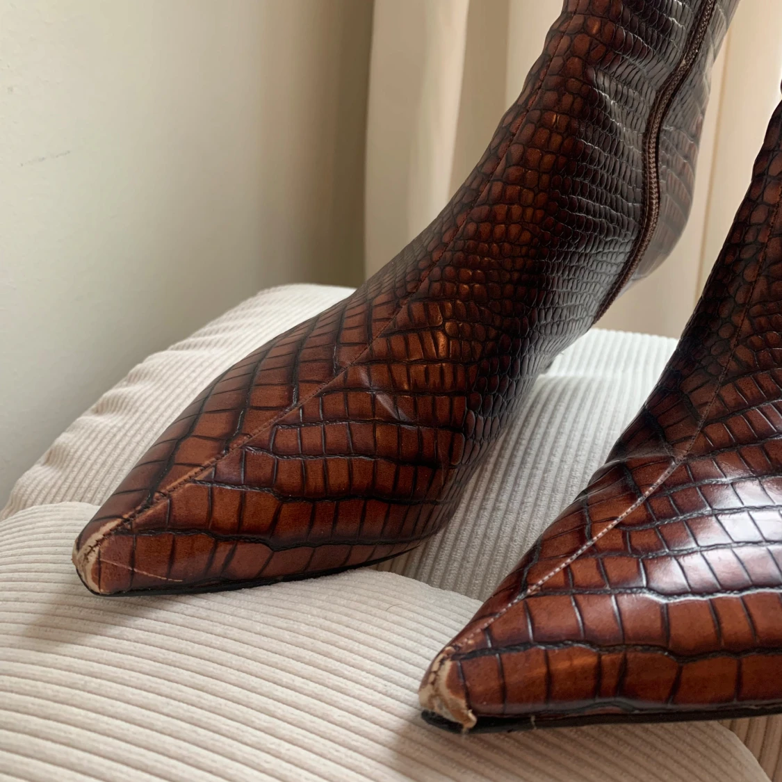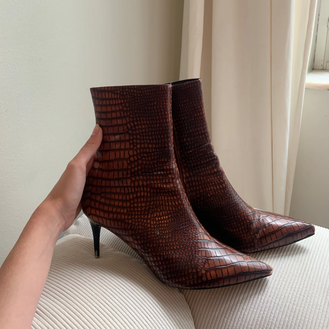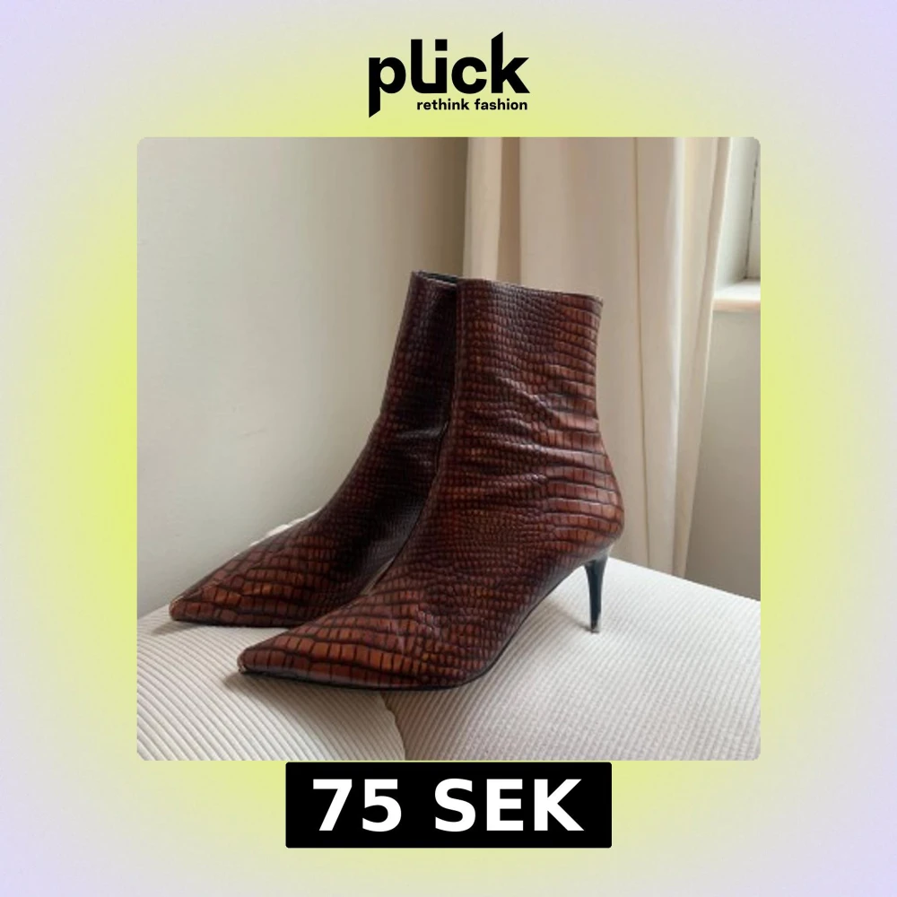 Snygga bruna boots med spetsig tå och låg klack. Skorna har ett krokopräglat mönster. Perfekta för dig som vill sticka ut med en edgy vibe och gillar detaljer som sticker ut. Finns några skavanker men annars i bra skick💗
