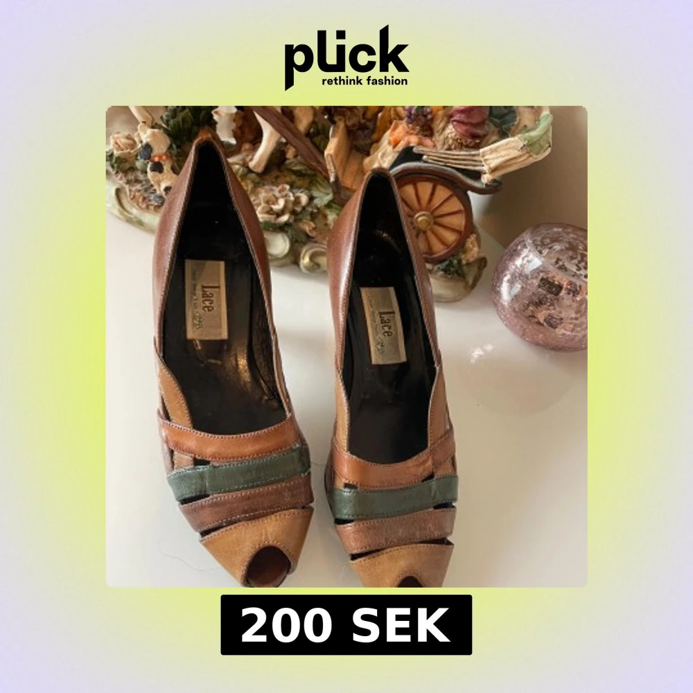 Snygga bruna vintage klackskor från Lace med öppen tå och flätade detaljer i grönt och brunt. Skorna har en elegant klack och är tillverkade i skinn, vilket ger en lyxig känsla. Perfekta för att ge en stilfull touch till din outfit.kan möta er i Stockholm utanför Åhléns i T-Central