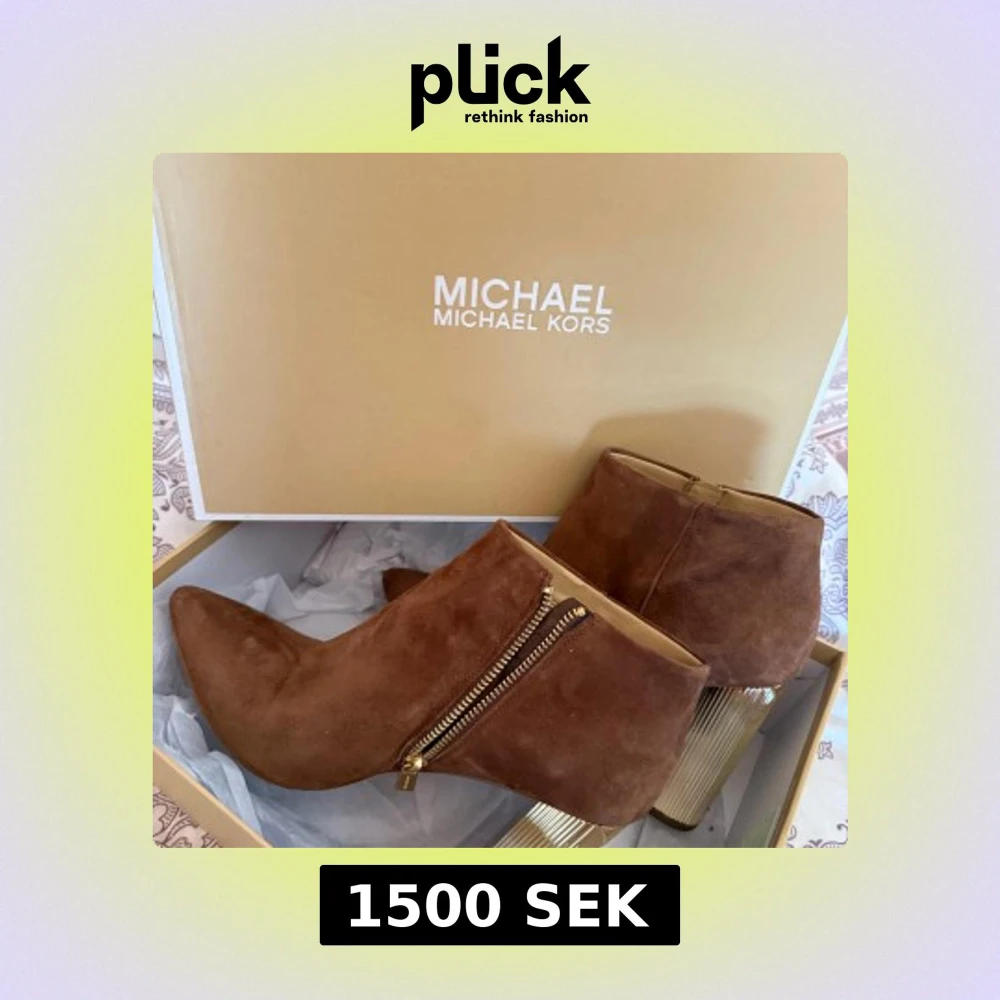 Säljer ett par snygga bruna boots i mocka från Michael Kors. Skorna har guldfärgade dragkedjor på sidan och en klack som ger extra höjd. Perfekta för dig som vill ha en stilren och trendig look. Använda endast 1 gång