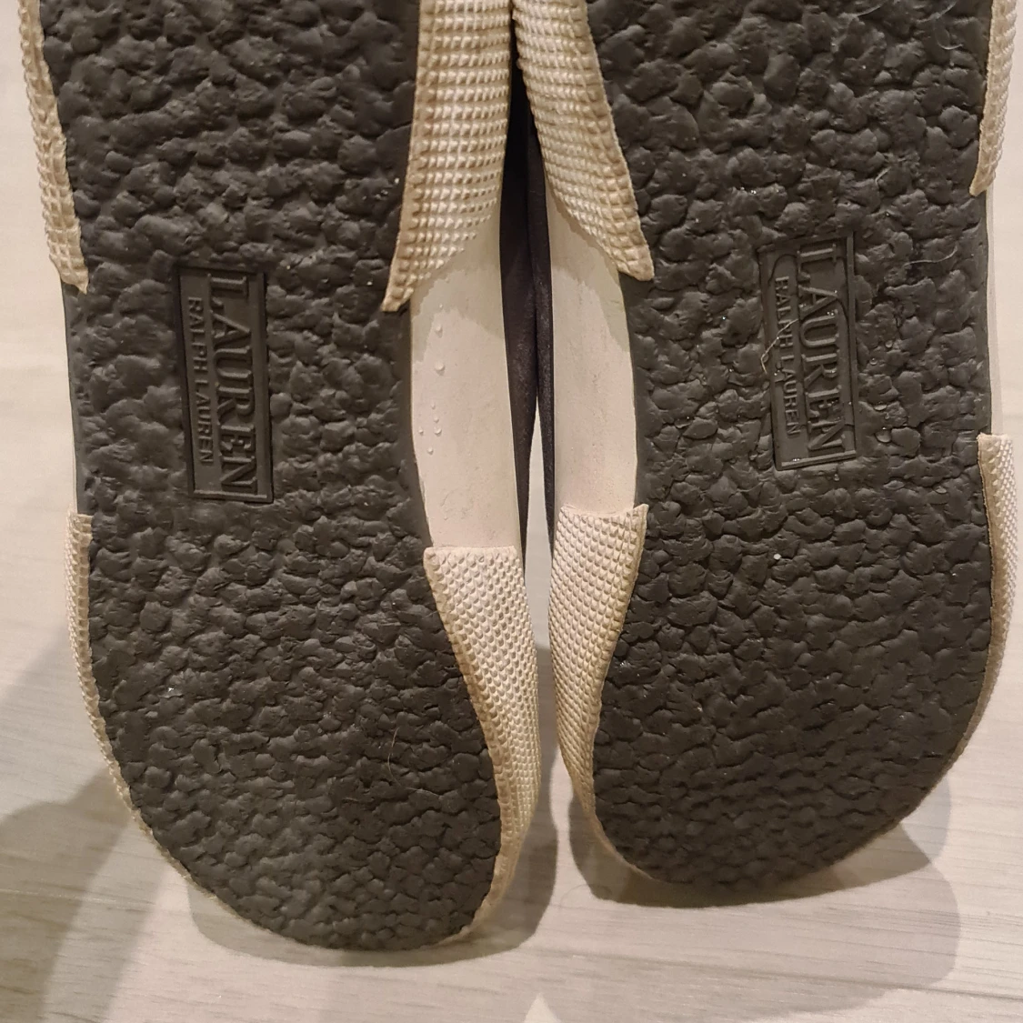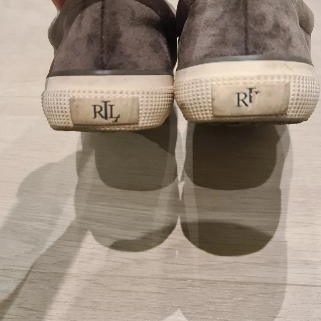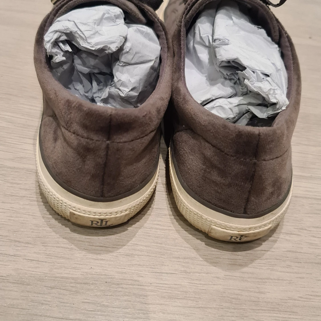 Snygga bruna sneakers från Ralph Lauren i mjuk mocka med vit platt sula och svarta snören. Skorna har rund tå och diskret RL-logga på hälen samt Lauren Ralph Lauren-märkning under sulan. Perfekt för dig som gillar klassisk stil med en twist. 24,5 cm i storlek