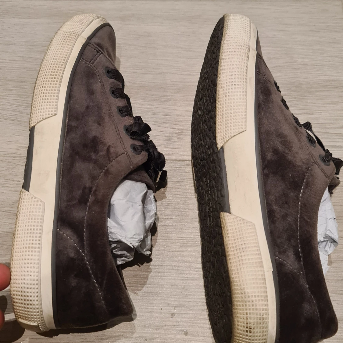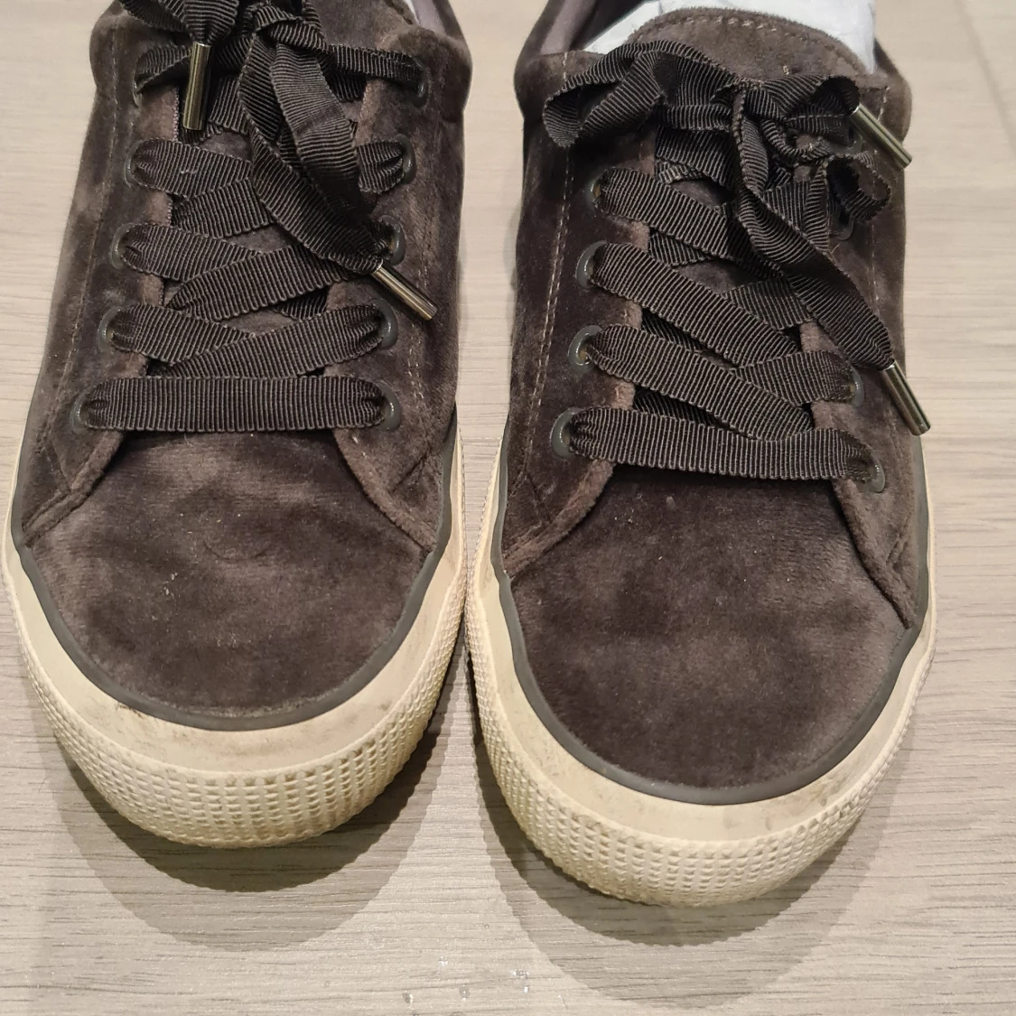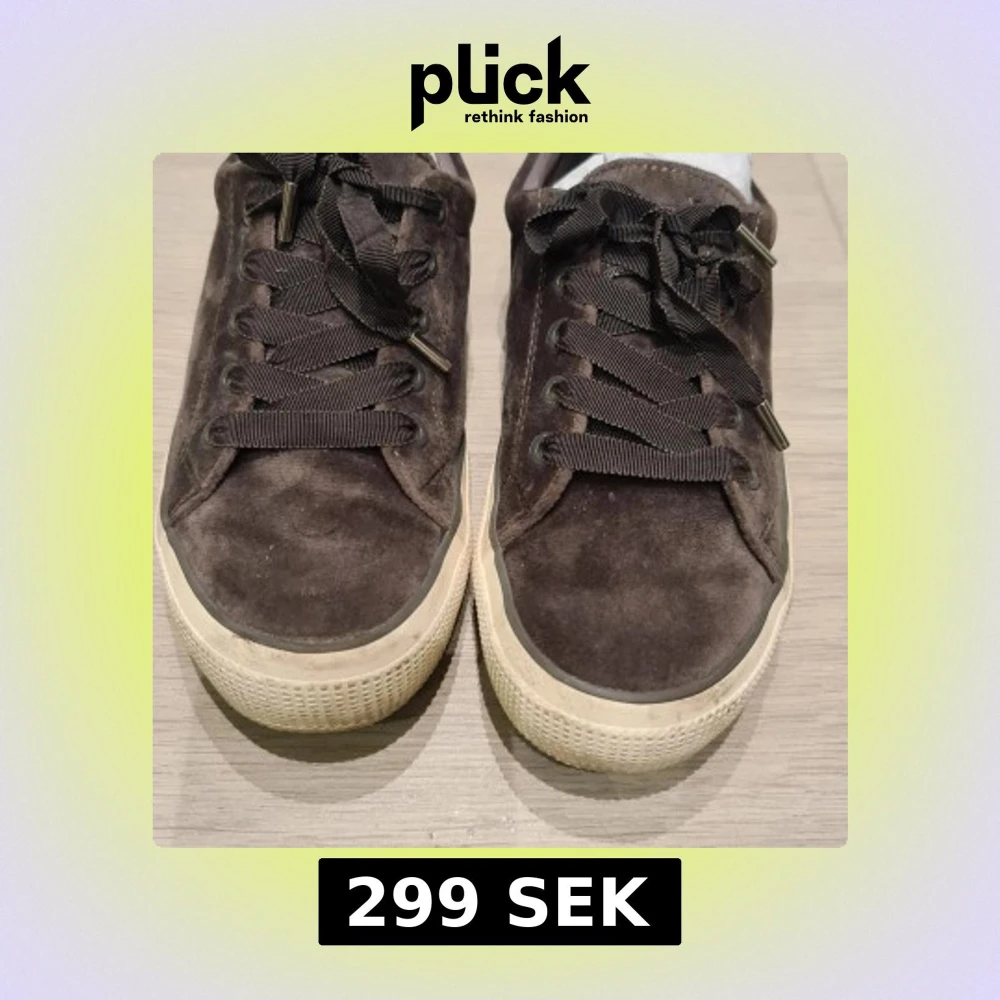 Snygga bruna sneakers från Ralph Lauren i mjuk mocka med vit platt sula och svarta snören. Skorna har rund tå och diskret RL-logga på hälen samt Lauren Ralph Lauren-märkning under sulan. Perfekt för dig som gillar klassisk stil med en twist. 24,5 cm i storlek