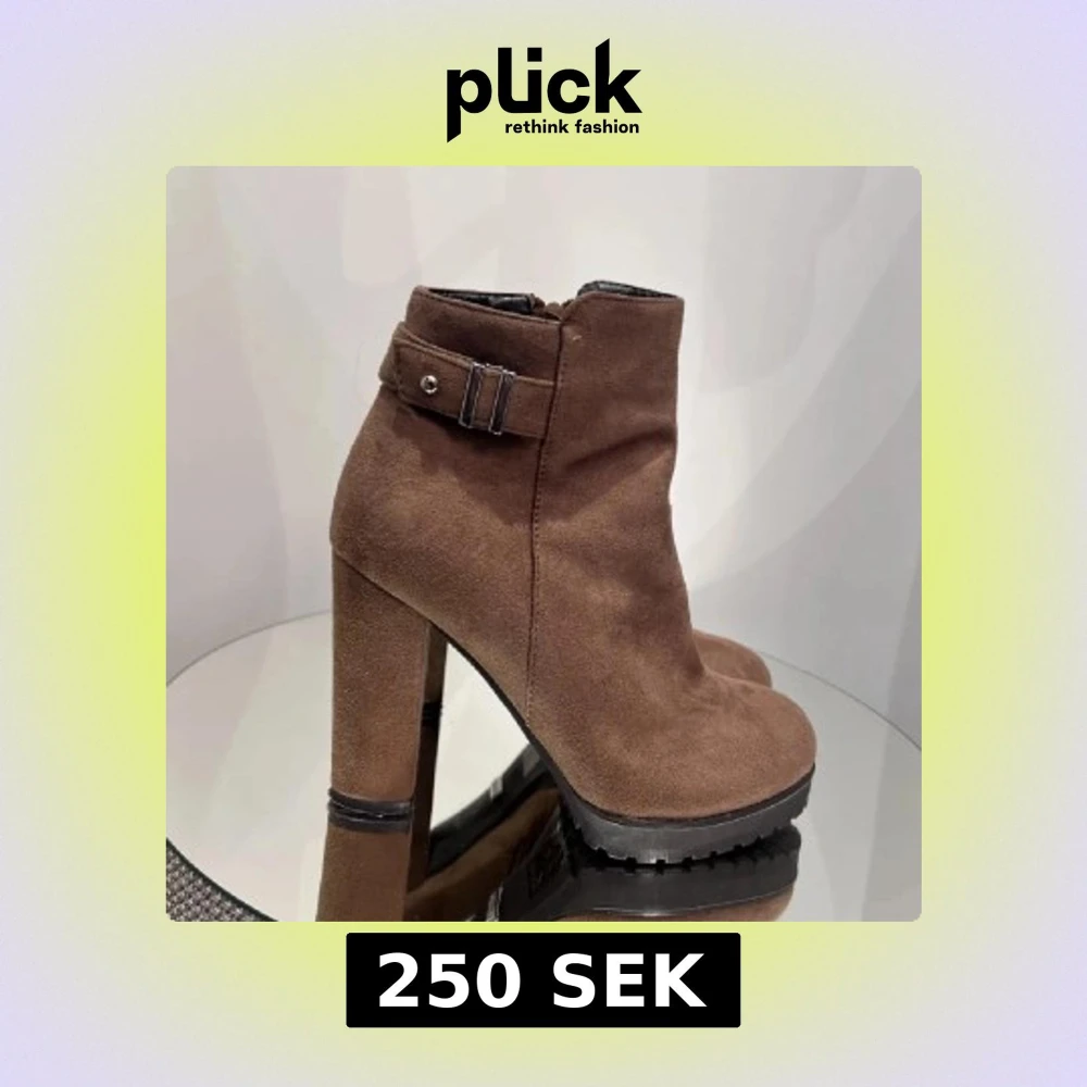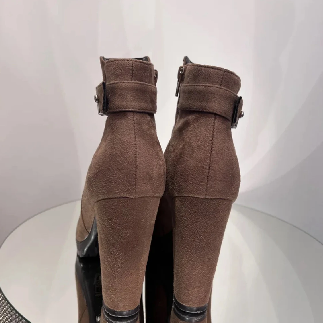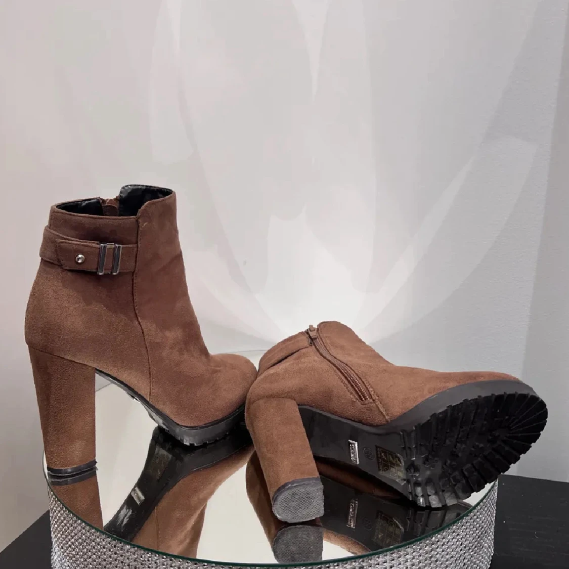 Snygga bruna stövletter i mocka med hög klack och plattformssula. Skorna har rund tå, dekorativt spänne runt ankeln och dragkedja på insidan för enkel påtagning. Perfekt för dig som vill ha en trendig och stilren look.