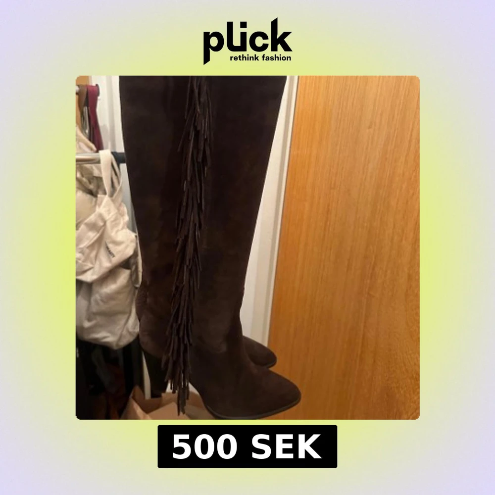 Snygga bruna stövlar i mocka från Zara med fransdetaljer längs sidan. De har en spetsig tå och en stabil klack som ger en elegant look. Perfekta för att ge din outfit en bohemisk touch.