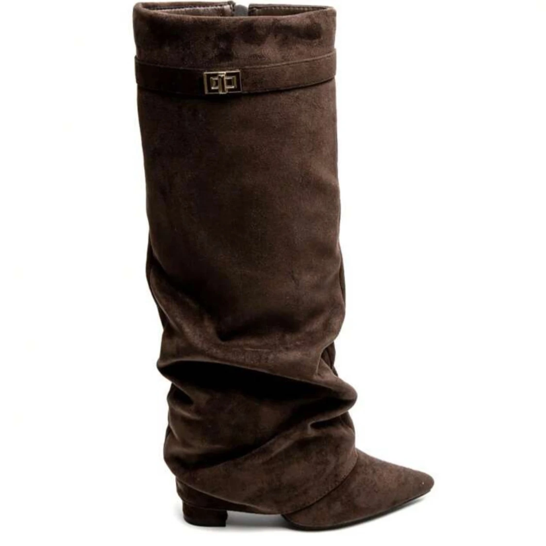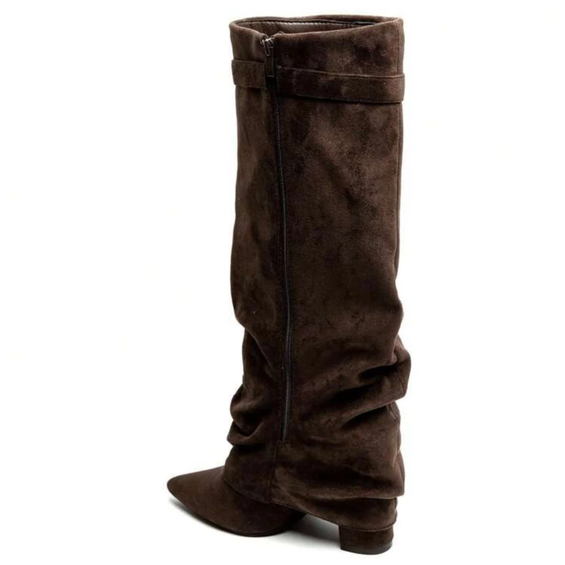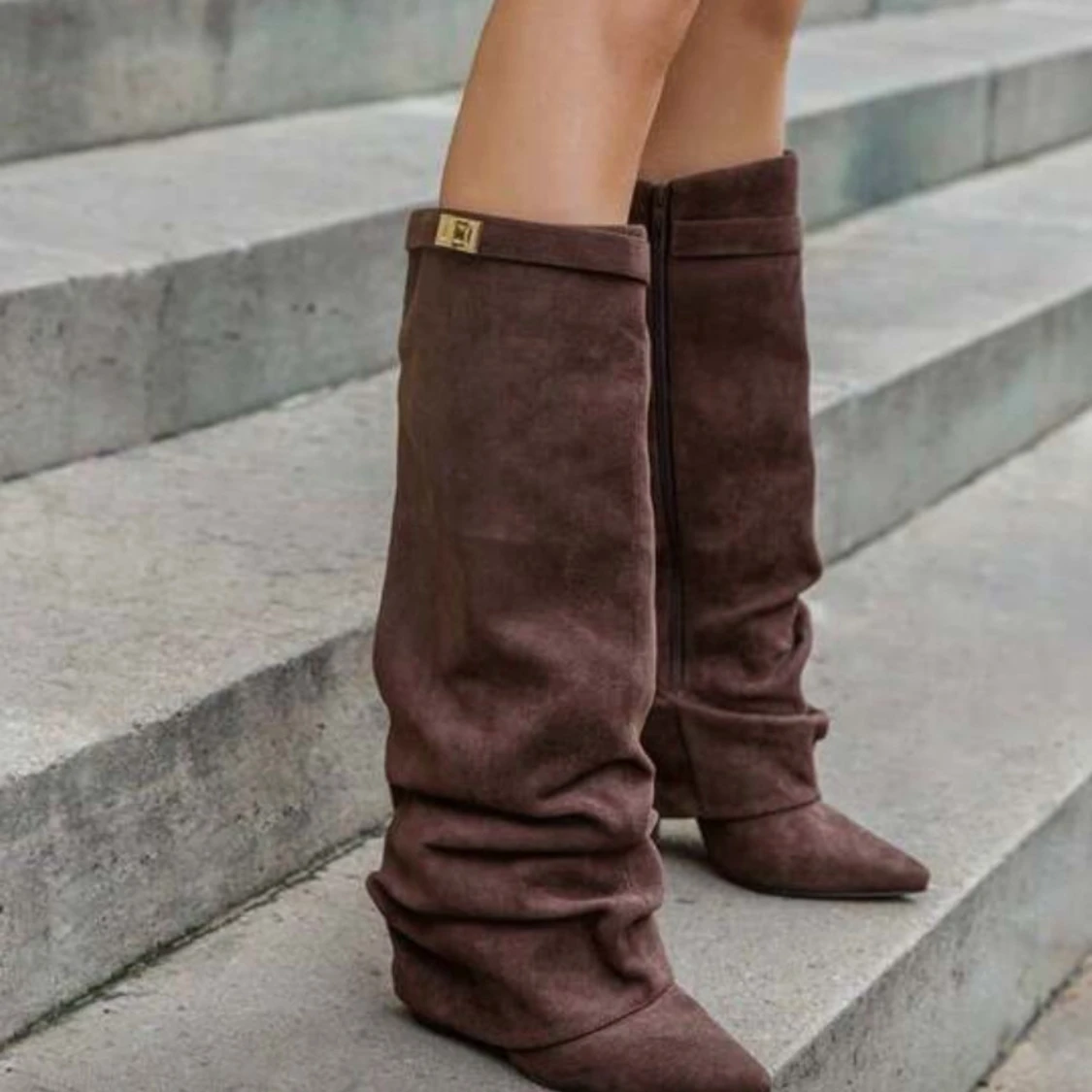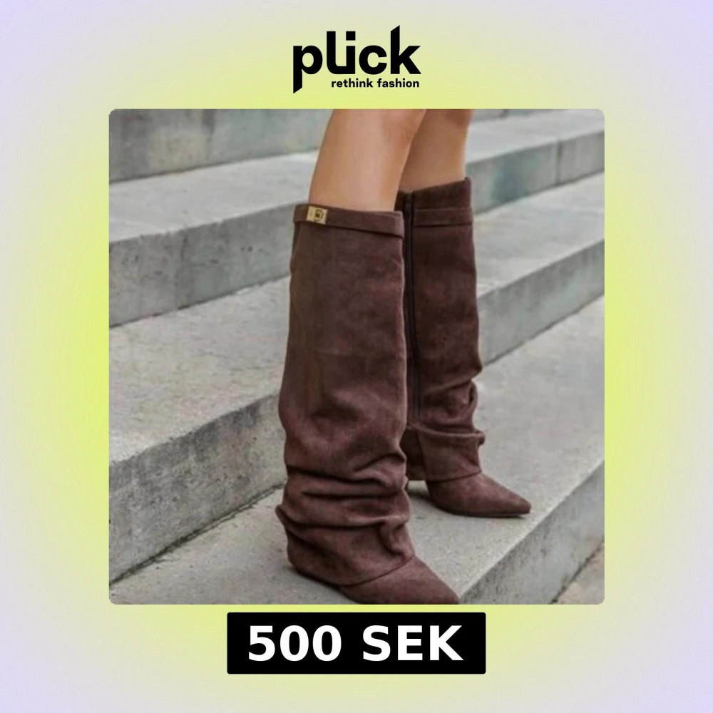 Säljer ett par skit snygga bruna stövlar i mocka med slouchy passform och spetsig tå. Stövlarna har låg klack, dekorativt spänne upptill och dragkedja på sidan. Perfekta för dig som vill ha en cool och trendig look till hösten. Helt oanvända och nya säljer då de inte passade. Passar storlek 38/39