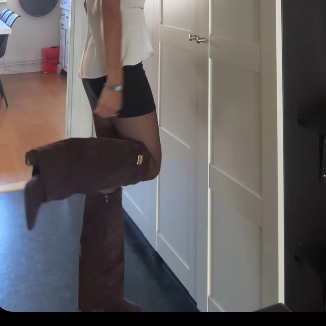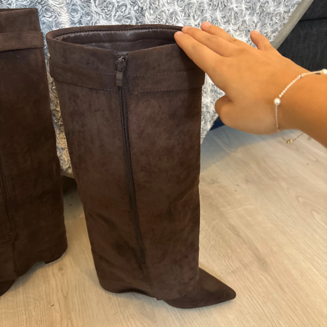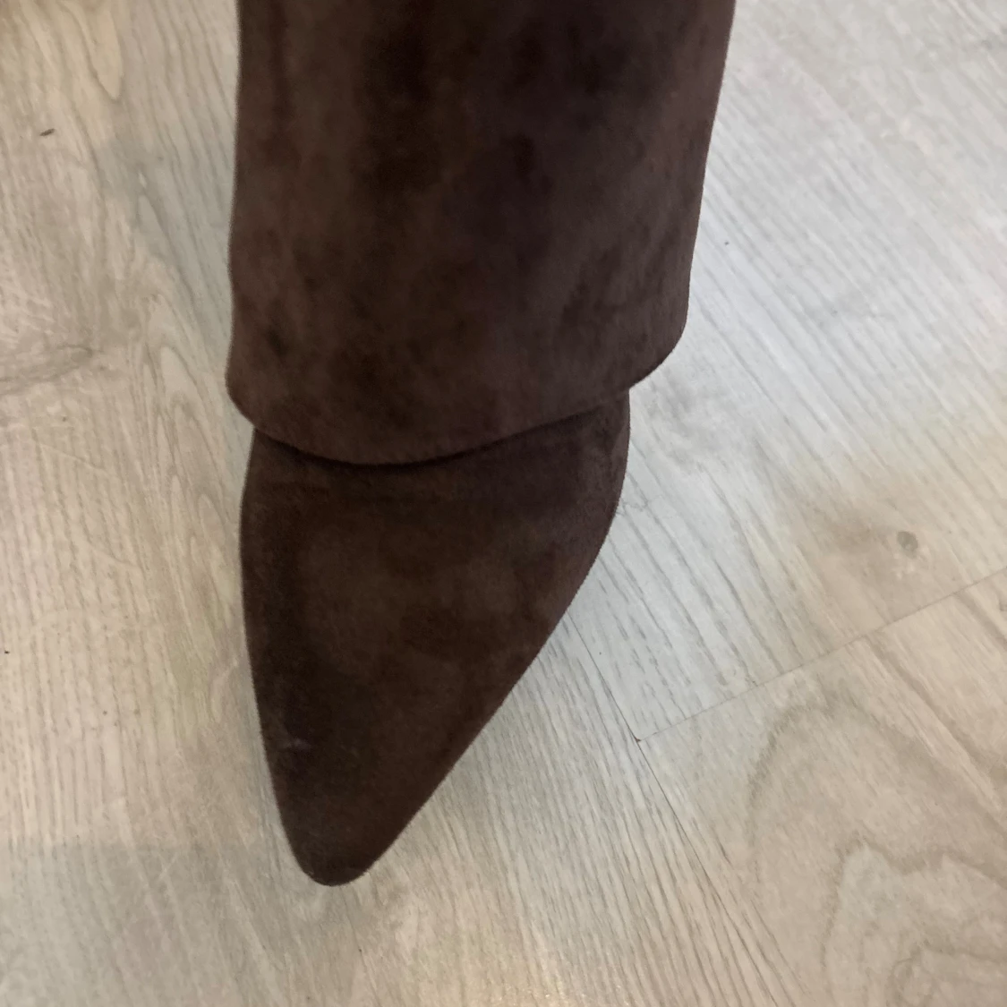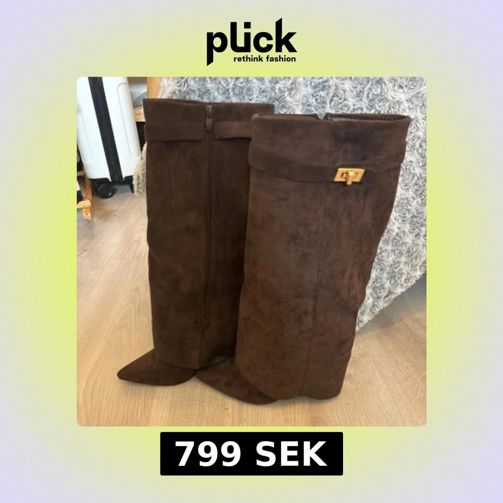 Säljer ett par höga bruna stövlar i mocka med spetsig tå och låg klack. Stövlarna har dragkedja på insidan och en snygg guldfärgad detalj upptill. Perfekta till höst- och vinterlooken och passar till både kjol och byxor.
