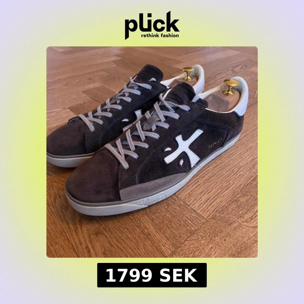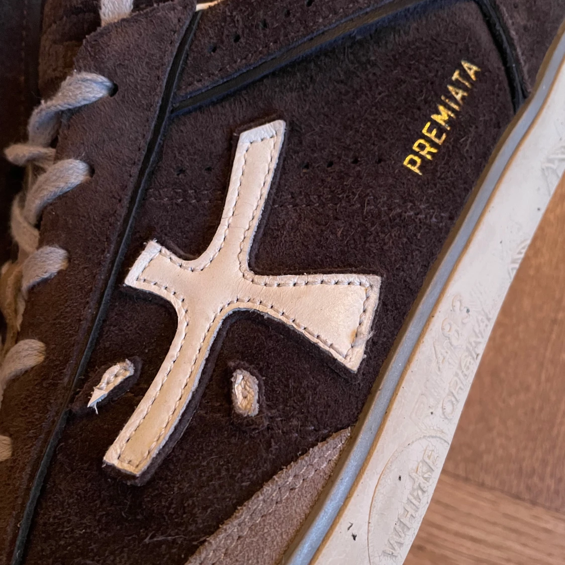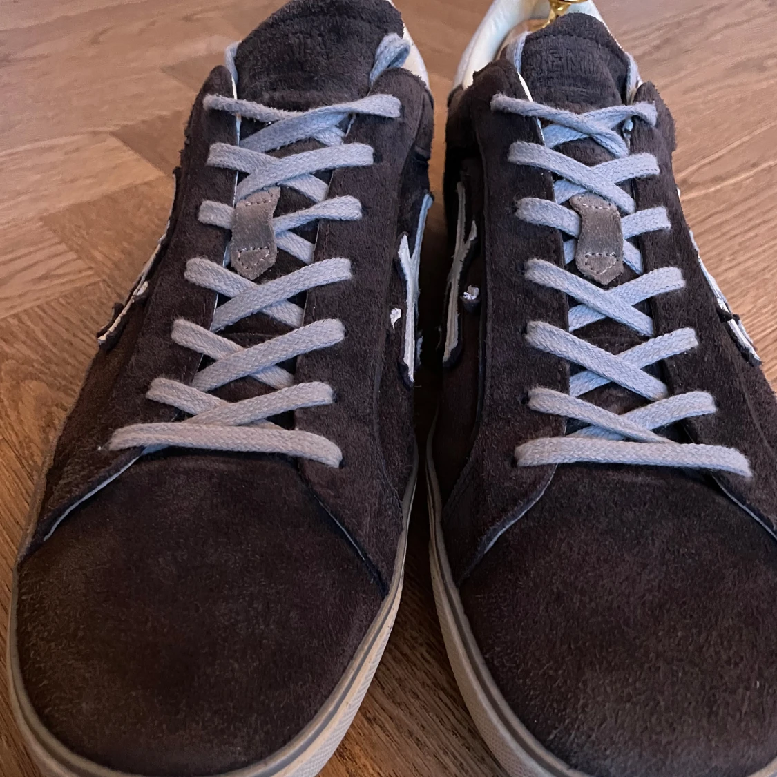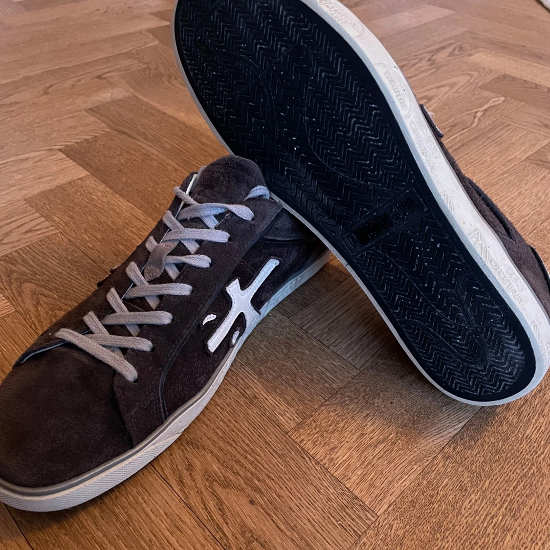 Snygga bruna sneakers från Premiata i mocka med vita detaljer och grå snörning. Skorna har en rund tå och en diskret logga på sidan. Perfekta för en stilren look. Skorna är i otroligt bra skick! Allt originellt medföljer. Hör av er vid intresse så löser vi en smidig affär!🤩