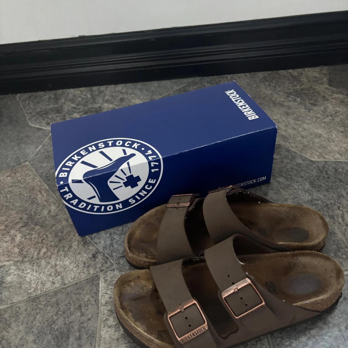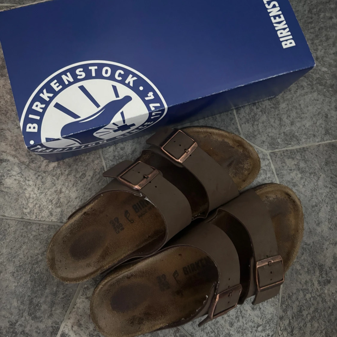 Bruna Birkenstock sandaler med två breda remmar och justerbara metallspännen i kopparfärg. Klassisk korksula som formar sig efter foten och ger skön komfort. Perfekta för sommaren och riktigt chill stil. Nypris 1200kr mitt pris 650kr