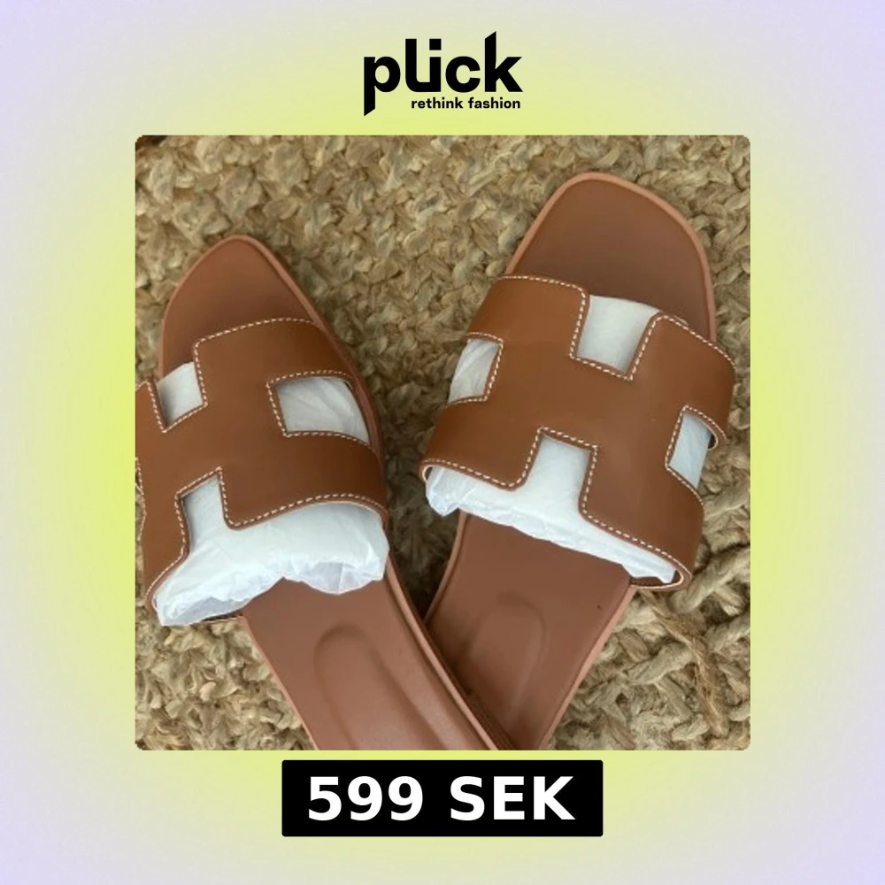 Snygga bruna sandaler med öppen tå och platt sula. De har en stilren H-formad rem i skinn med vita sömmar som ger en exklusiv vibe. Perfekta för varma dagar och passar till både jeans och klänning.(passar fötter som är 25 cm och det motsvarar storlek 39)
