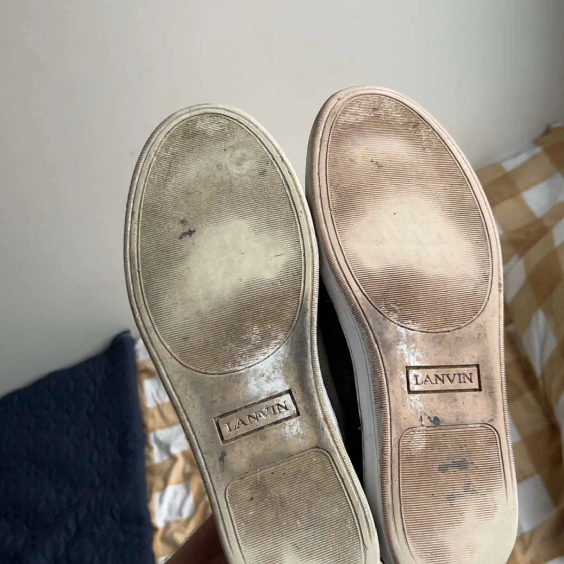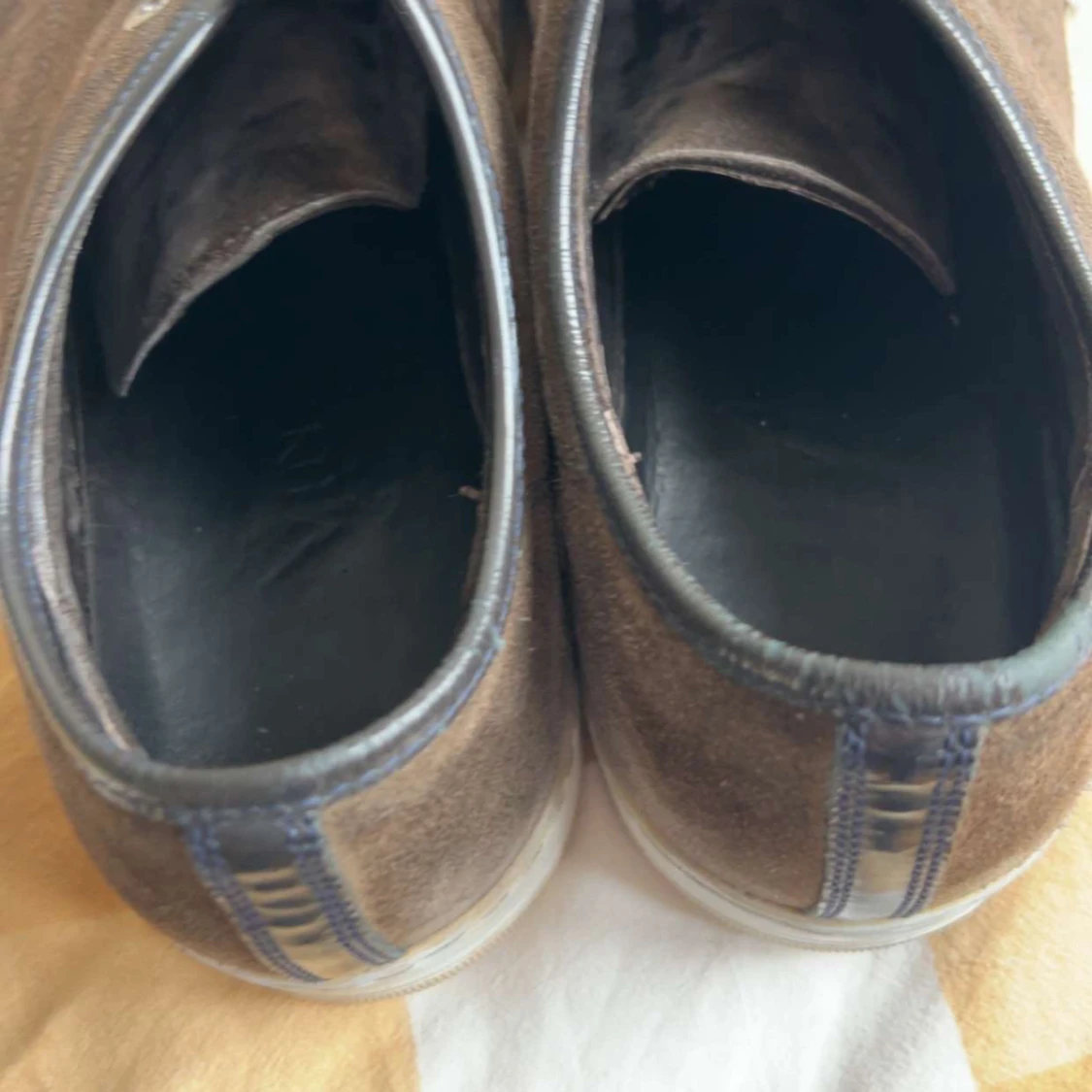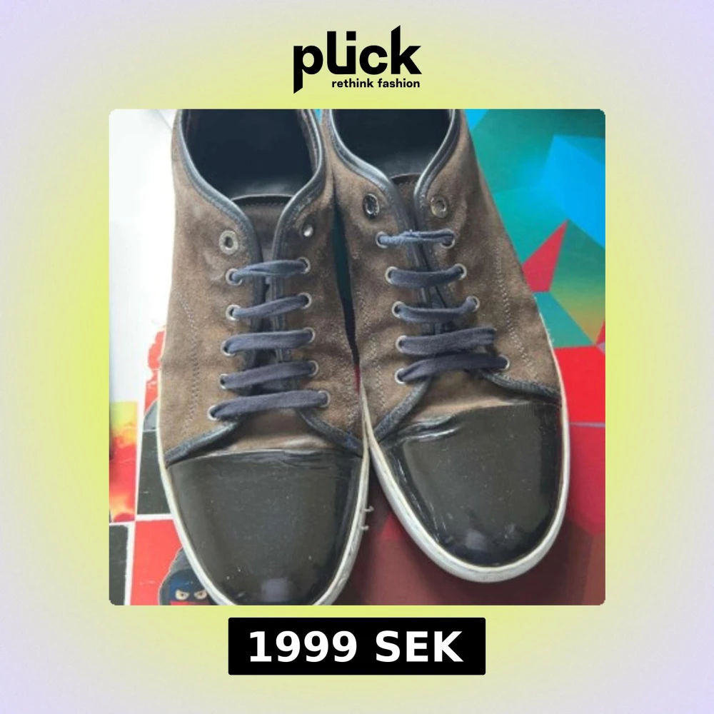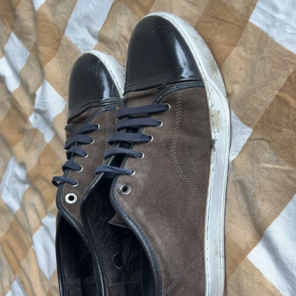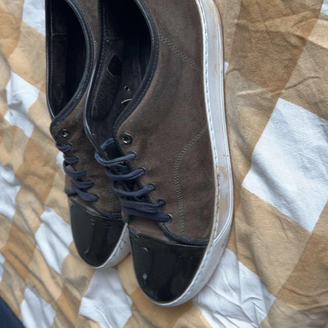 Snygga bruna sneakers från Lanvin med svart tåhätta i lack och mörka snören. Skorna har en vit sula och är tillverkade i mocka vilket ger dem en stilren look. Perfekta för en casual stil.