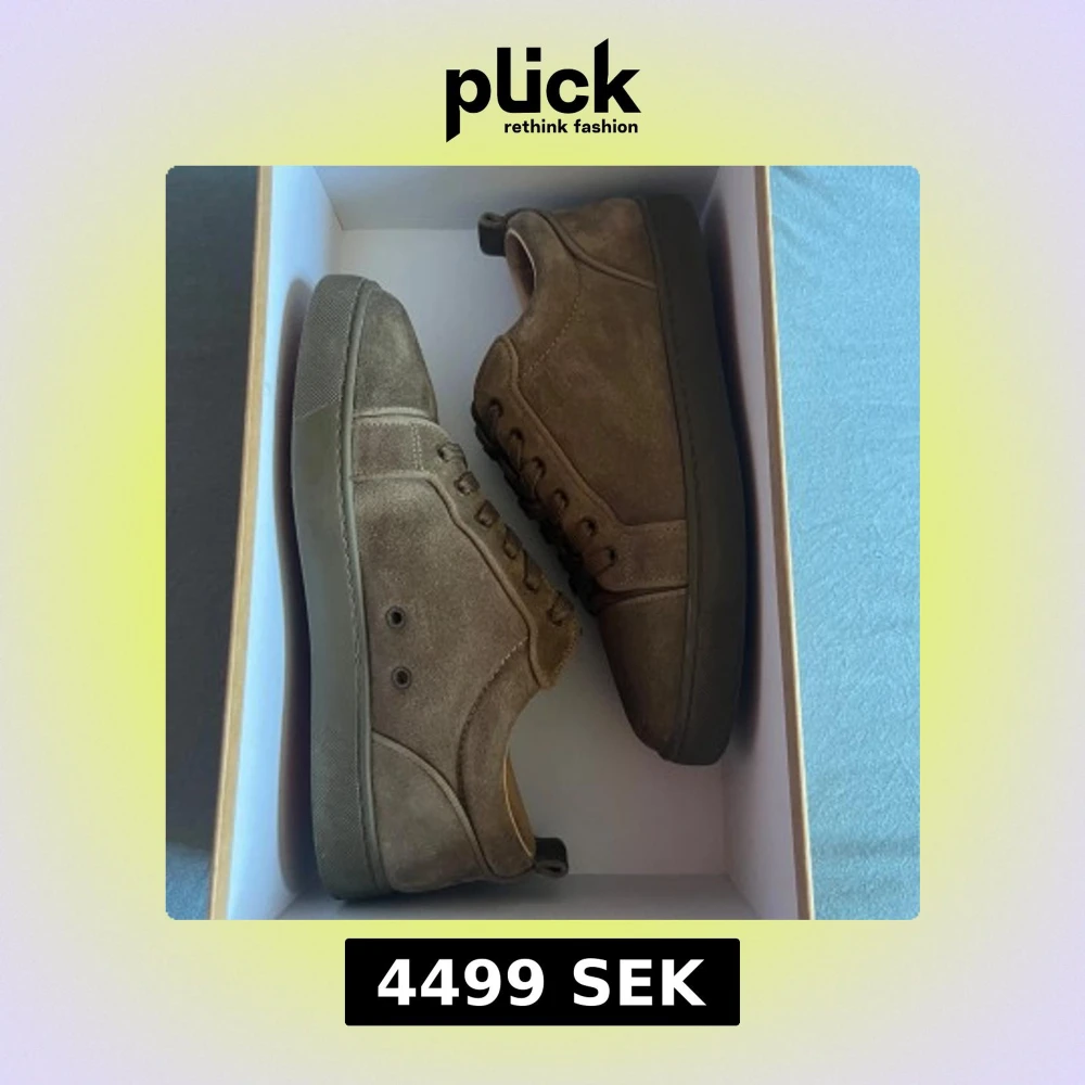 Snygga bruna sneakers i mocka från Louboutin med den ikoniska röda sulan. Skorna har snörning och en stilren design som passar perfekt för en trendig look. Finns mer bilder om man önskar det. Box,snören och dust bag ingår. Kvitto finns💸💫Pris ej fast hugget i sten