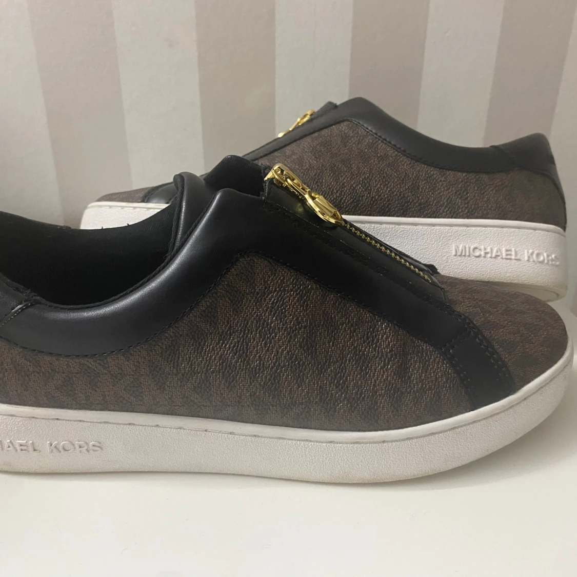 Säljer dessa snygga bruna sneakers från Michael Kors med svart läderdetalj och guldfärgad dragkedja för 1000kr då jag köpte de för 1500kr och eftersom dem inte kommit till användning då de bara använts ett par gånger. Dessa är i storlek 37.
