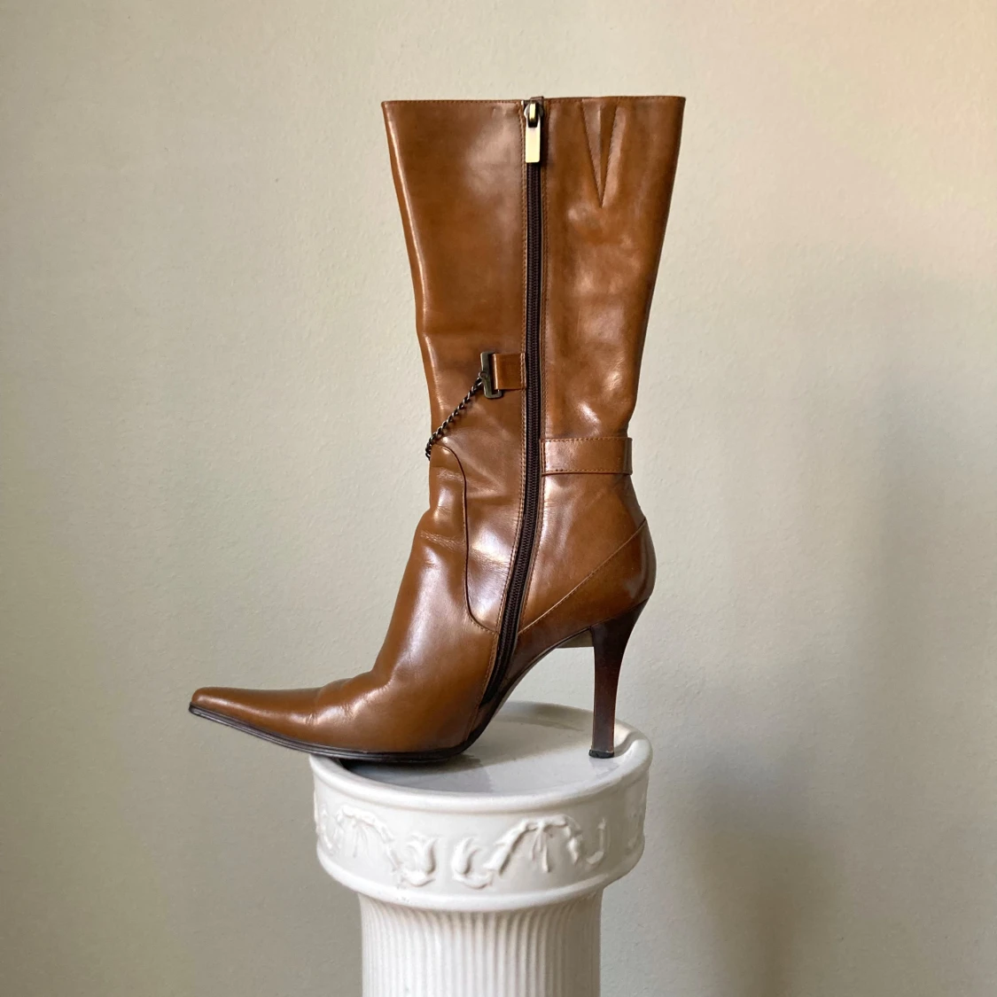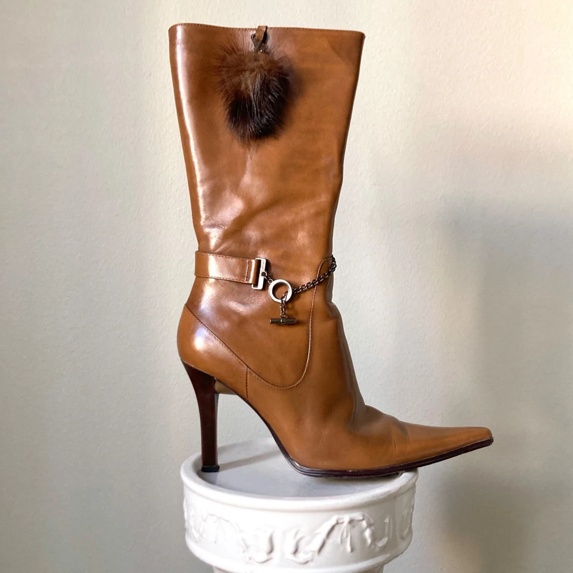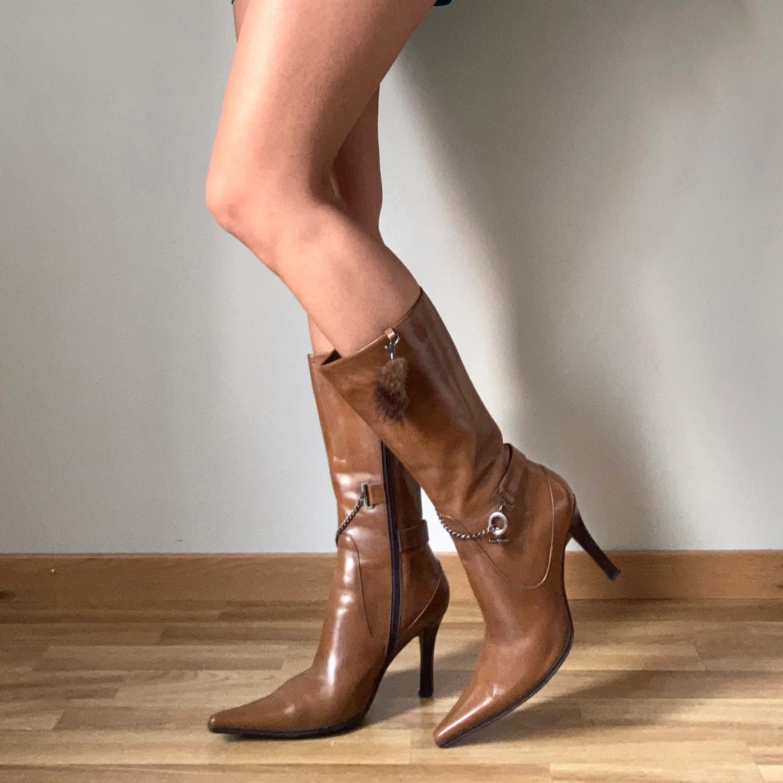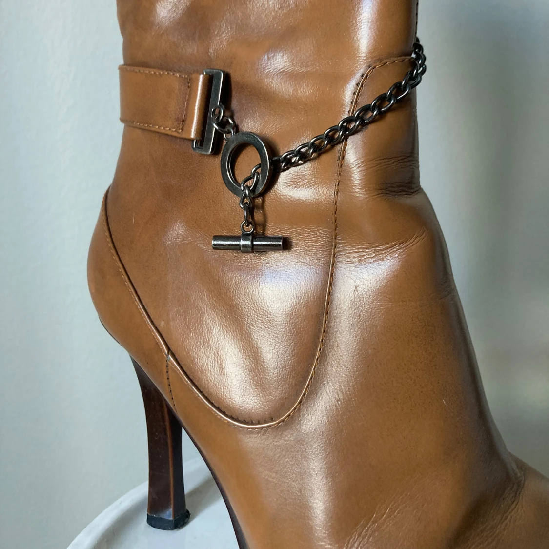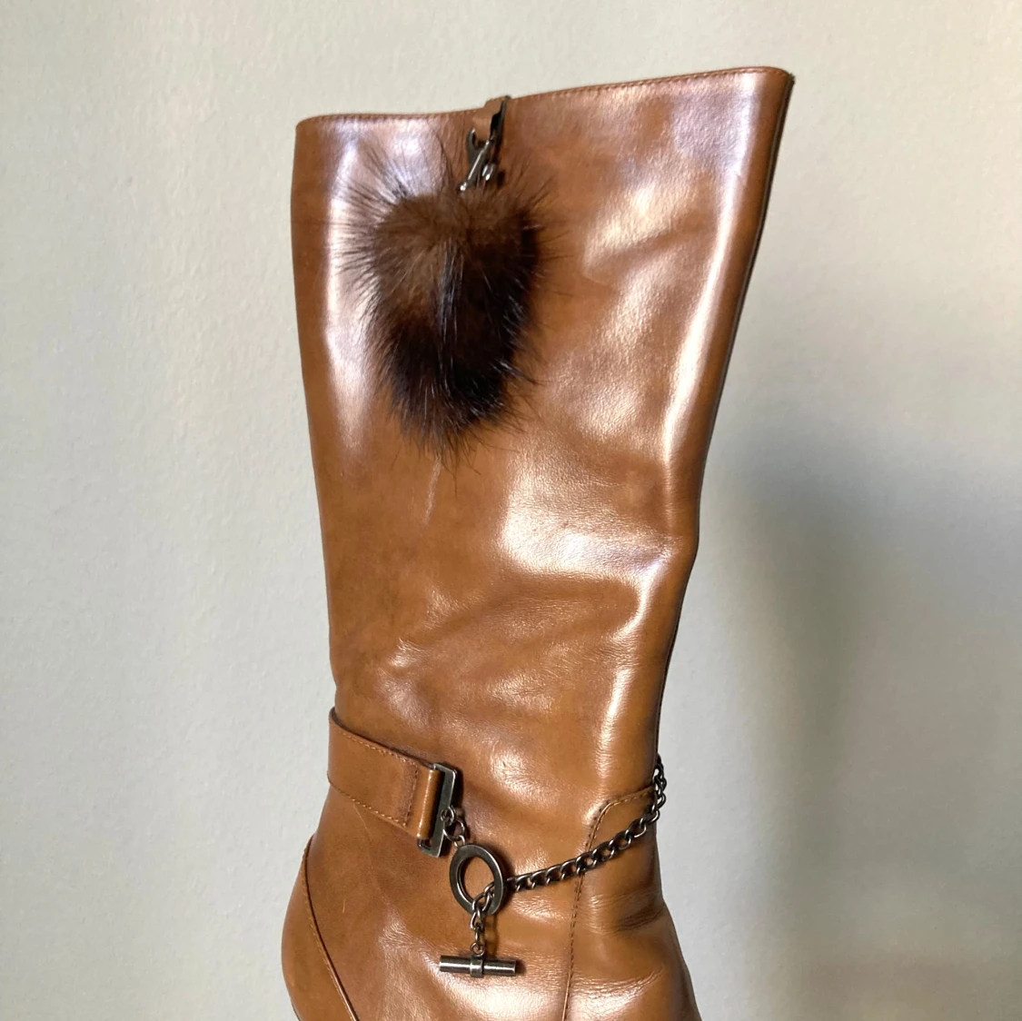 • Brown genuine leather heel boots with metallic chain and fur pendant detail • SIZE - EU 37 / US 7 / UK 5 • BRAND - Dorkan