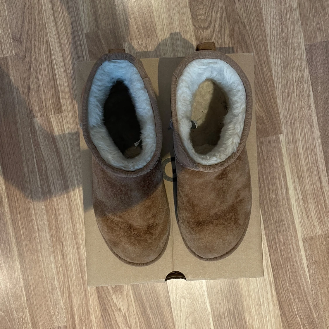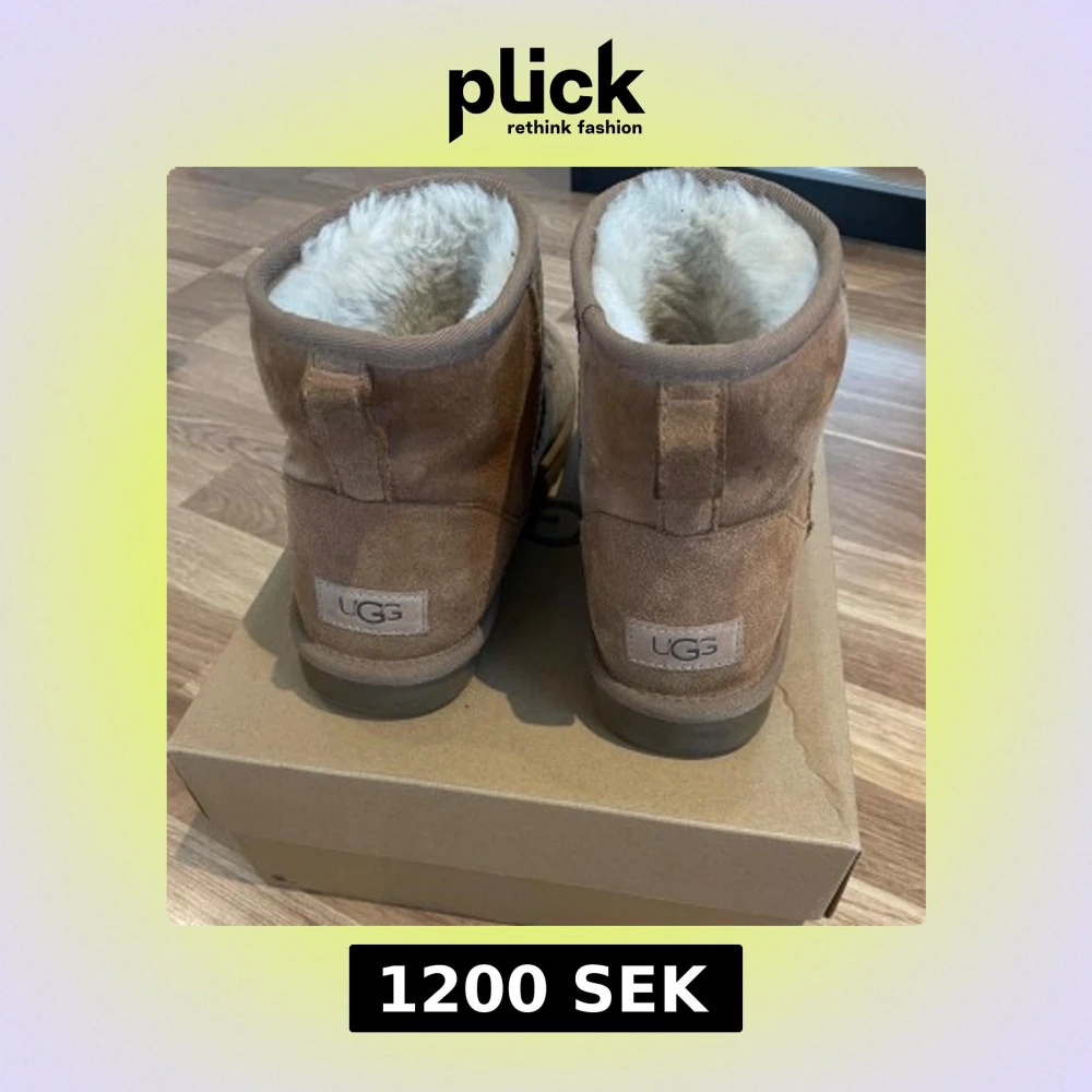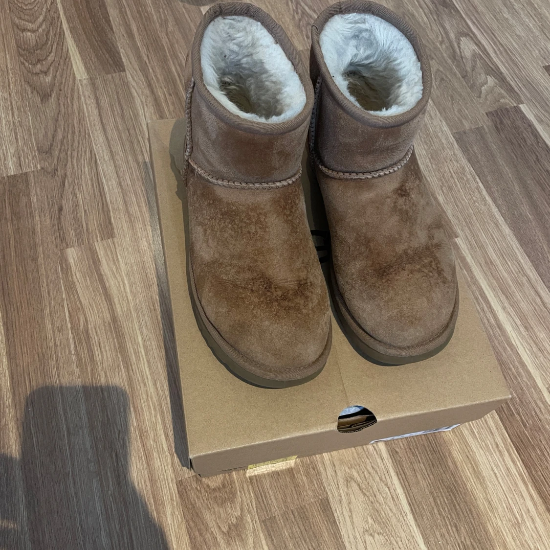 Mysiga bruna UGG boots i mocka med mjukt vitt fårfoder på insidan. Klassisk rund tå och platt sula, perfekta för kalla dagar. Ikonisk UGG-logga baktill och enkel slip-on-modell. Passar dig som vill ha både stil och komfort under vintern.