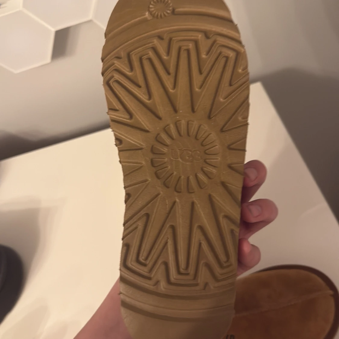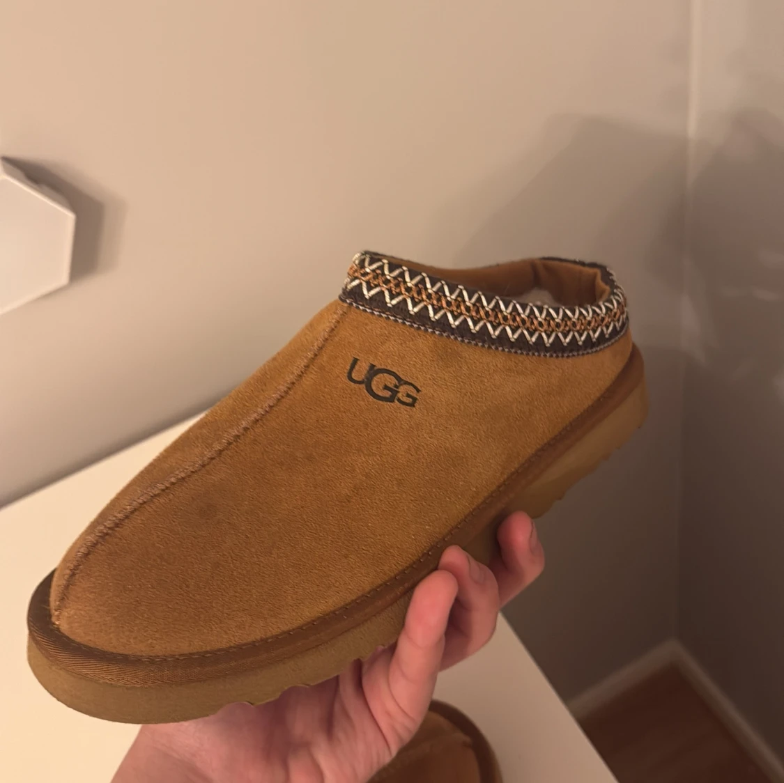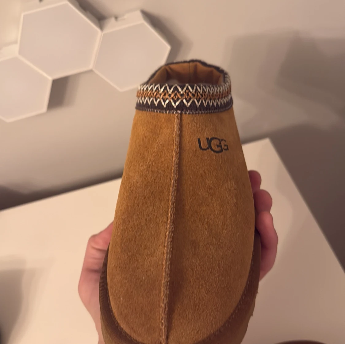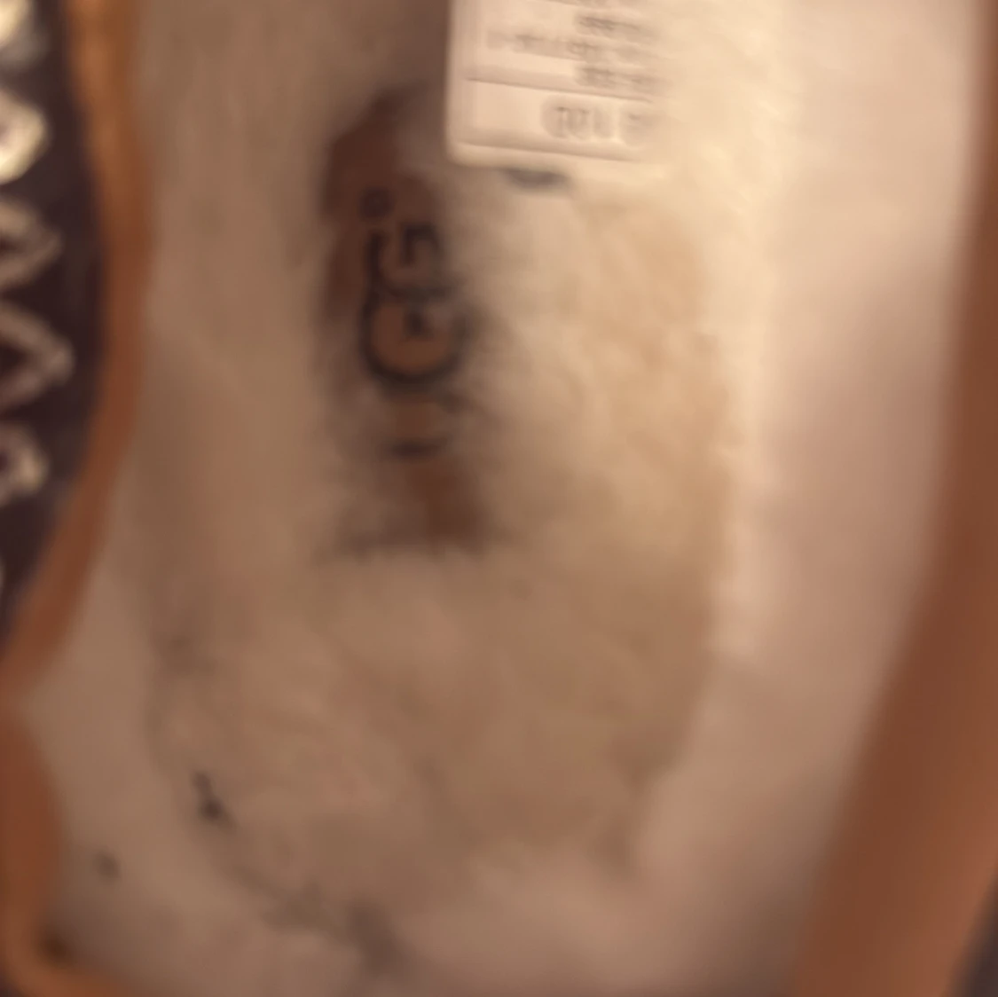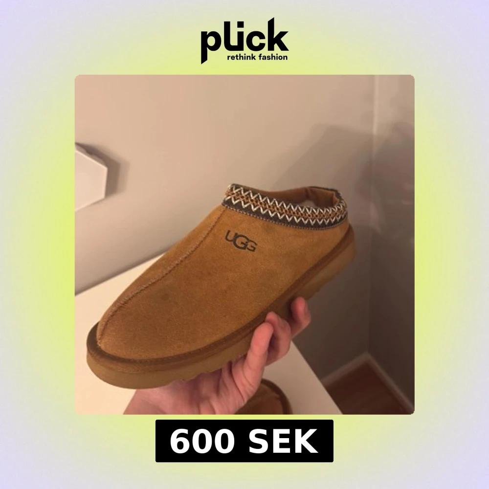 Säljer ett par bruna tofflor från UGG med ett snyggt mönster runt öppningen. De är gjorda i mocka och har en mjuk insida för extra komfort. Perfekta för att hålla fötterna varma och sköna. Nästan aldrig använda pga för små