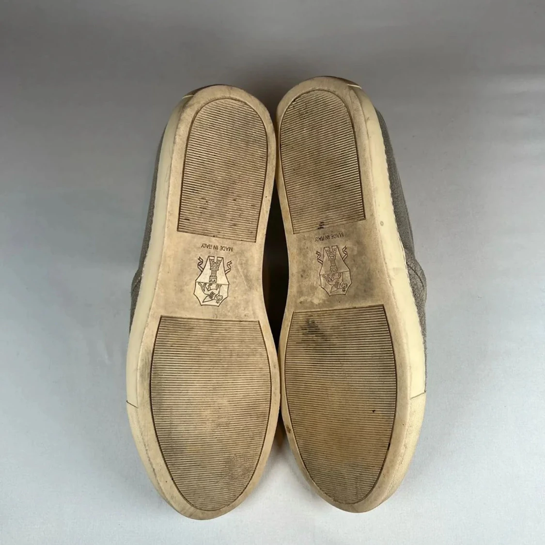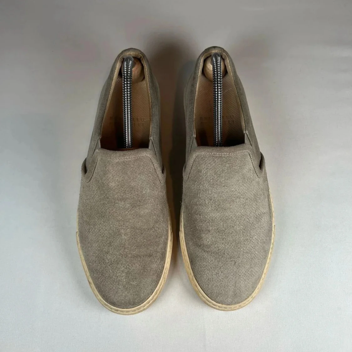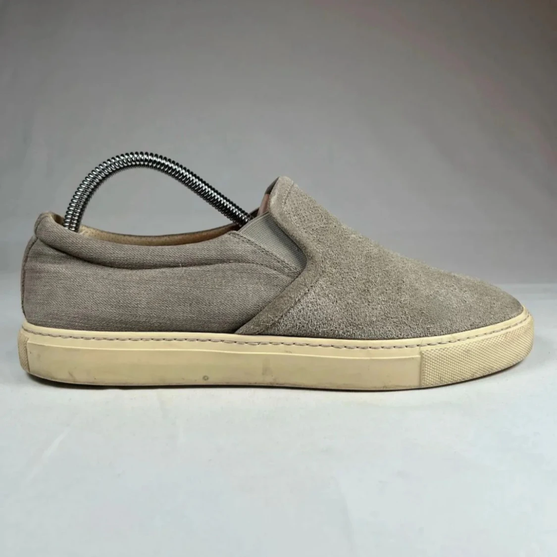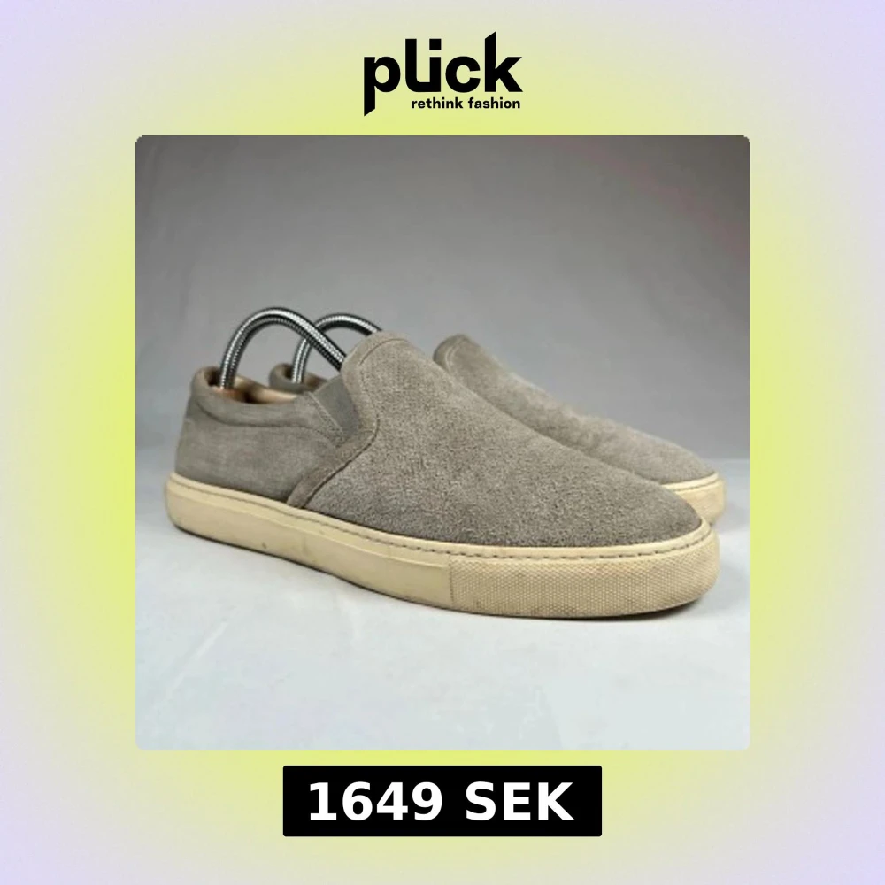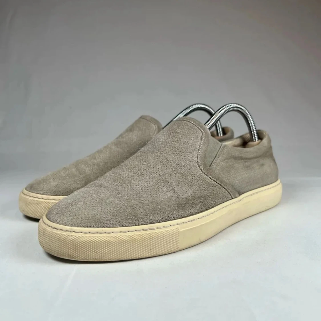 Stilrena slip-on sneakers i beige mocka med platt sula och rund tå. Skorna har elastiska paneler på sidorna för enkel påtagning och en krämfärgad yttersula som ger en clean look. Perfekta för dig som gillar minimalistisk och avslappnad stil.