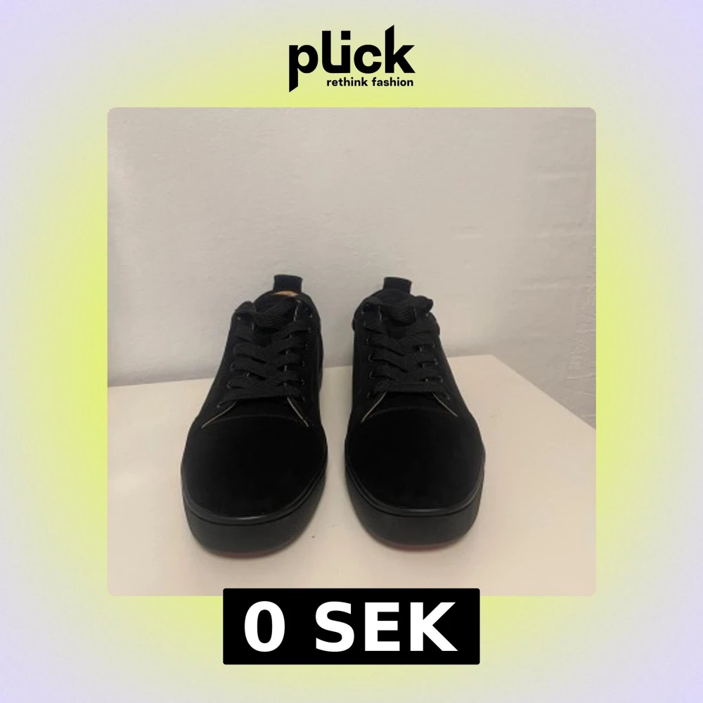 Säljer ett par svarta Christian Louboutins i mjuk mocka med klassisk röd sula och snygga svarta snören. Insidan är beige och har Paris-tryck. Skorna har rund tå och platt sula, perfekt för dig som gillar exklusiv stil med en twist.