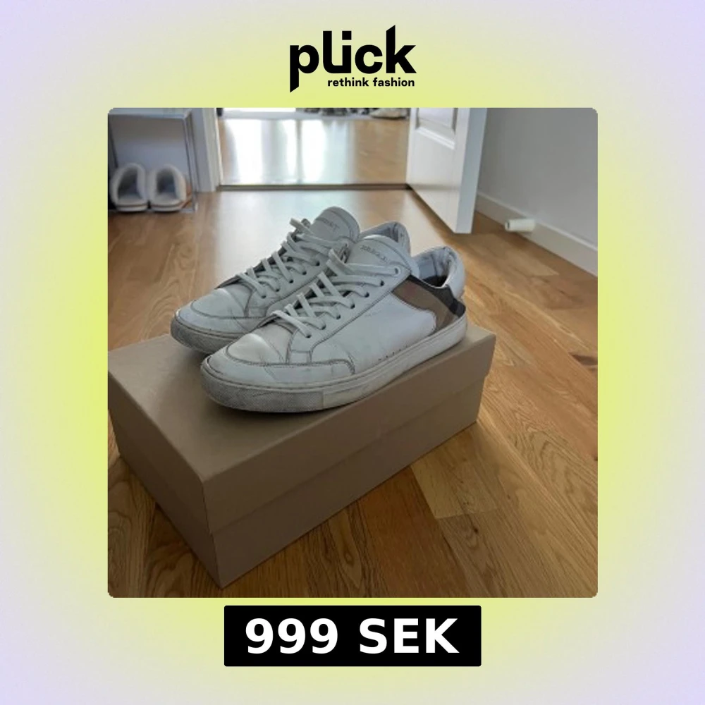 Snygga vita sneakers från Burberry med klassisk rutig panel i beige, svart och grått på hälen. Skorna har rund tå, platt sula och snörning framtill. Materialet är skinn och textil, och Burberry-loggan syns på plösen. Kommer med originalkartong,dustbag och kort.