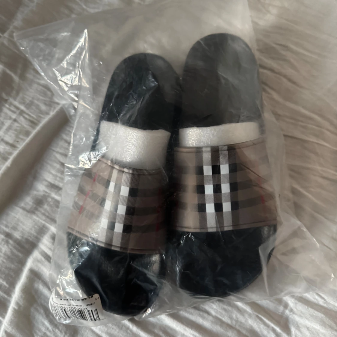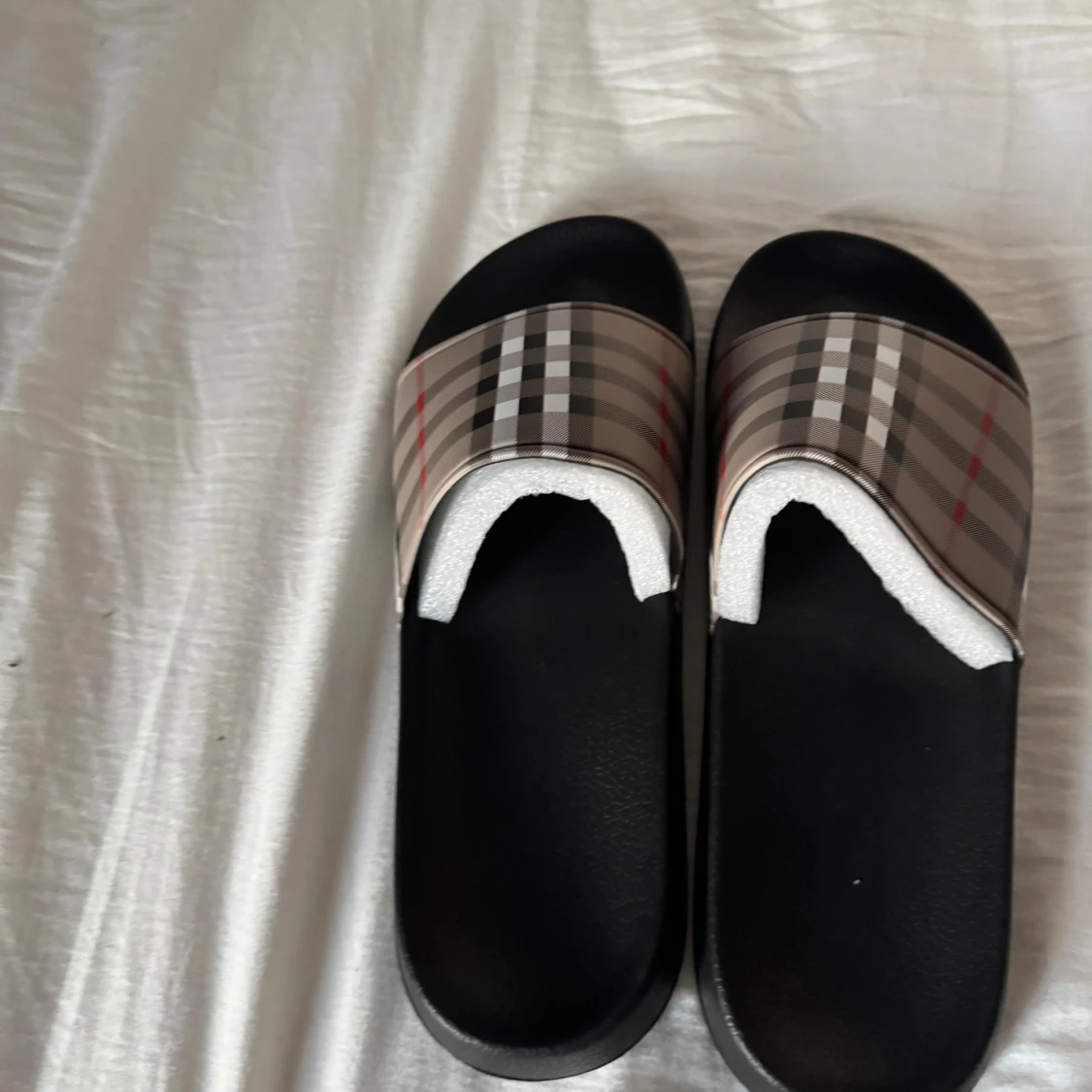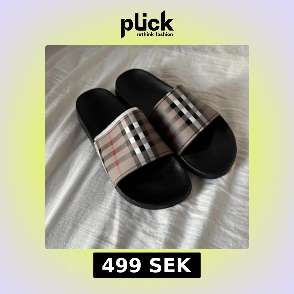 Snygga sandaler med klassiskt Burberry-rutigt mönster i beige, svart, vitt och rött. De har en bred rem över foten och svart platt sula i syntetmaterial. Perfekta för sommaren och riktigt trendiga att glida runt i.