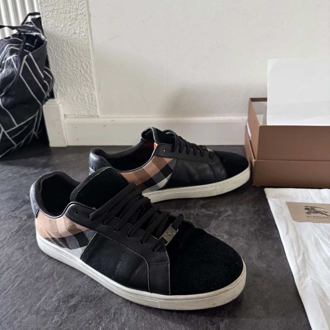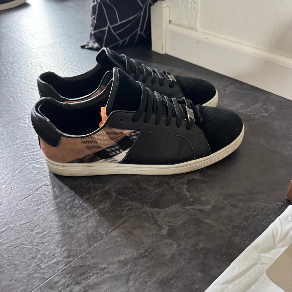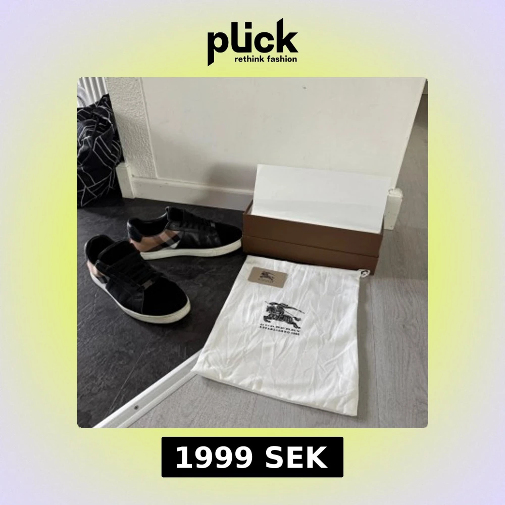 Snygga svarta sneakers från Burberry med klassisk rutig panel i beige, svart och vit på sidan. Skorna har snörning, rund tå och vit platt sula. Materialmix av skinn och mocka ger en lyxig känsla. Perfekta för dig som gillar designer och vill sticka ut med stil. Använda i några få månader och är i utmärkt skick.