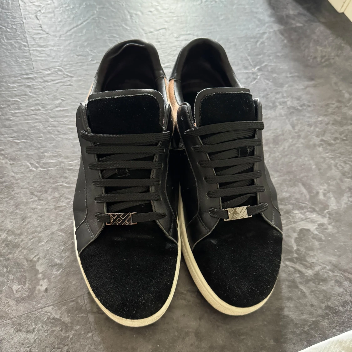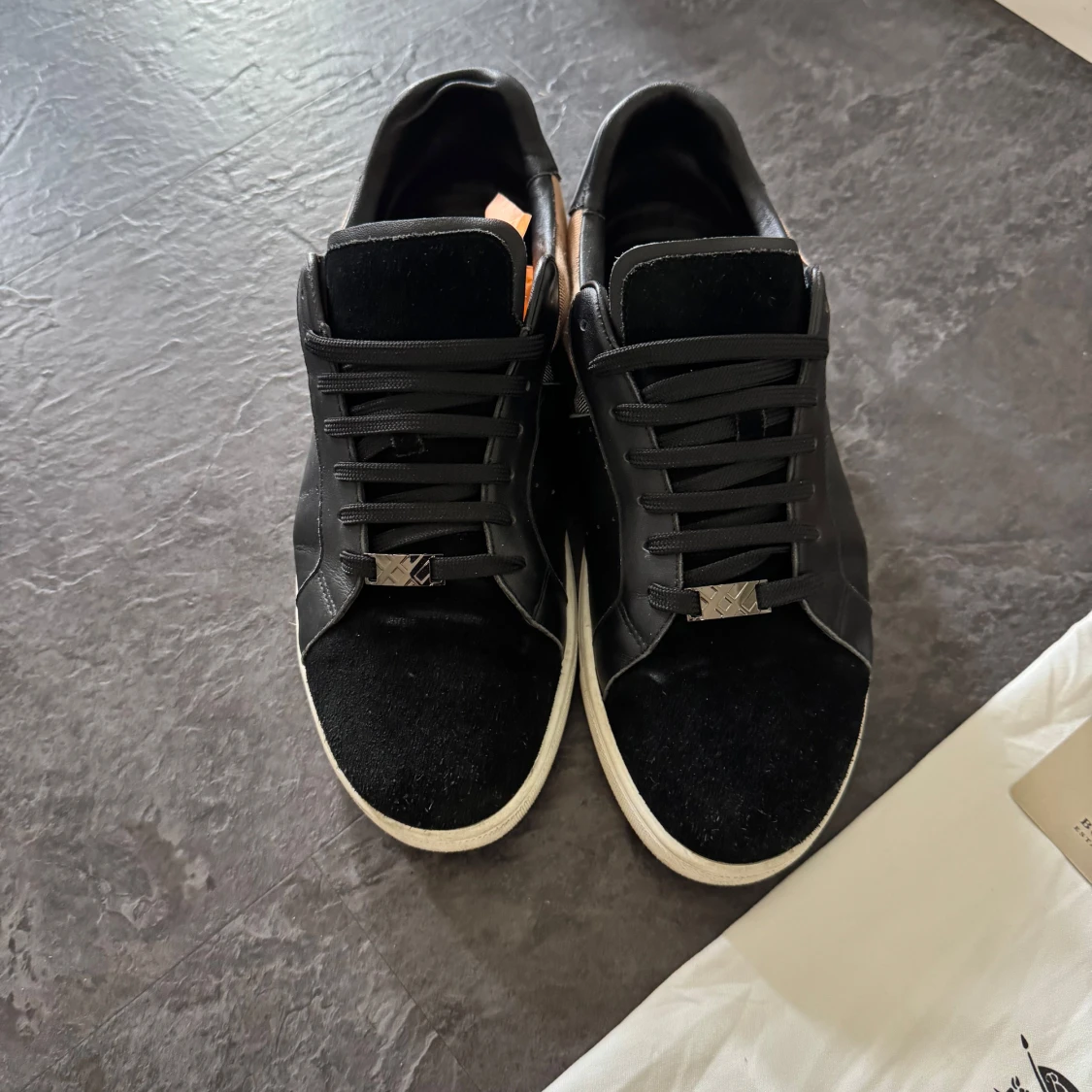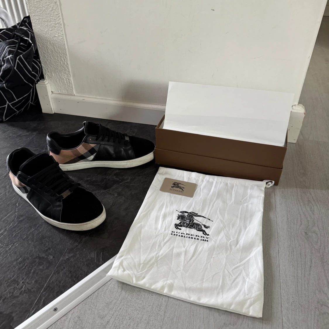 Snygga svarta sneakers från Burberry med klassisk rutig panel i beige, svart och vit på sidan. Skorna har snörning, rund tå och vit platt sula. Materialmix av skinn och mocka ger en lyxig känsla. Perfekta för dig som gillar designer och vill sticka ut med stil. Använda i några få månader och är i utmärkt skick.
