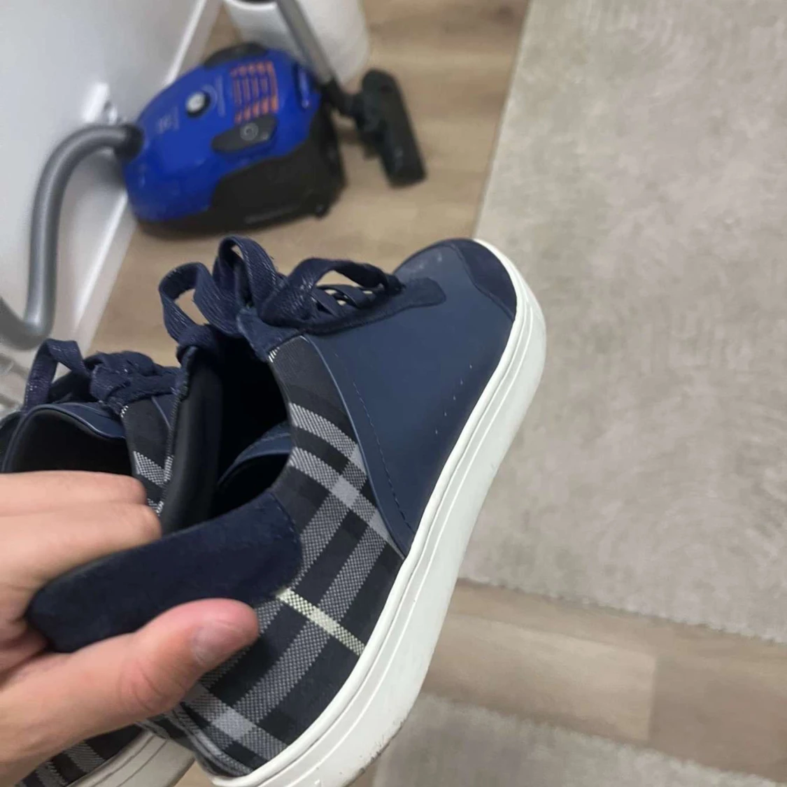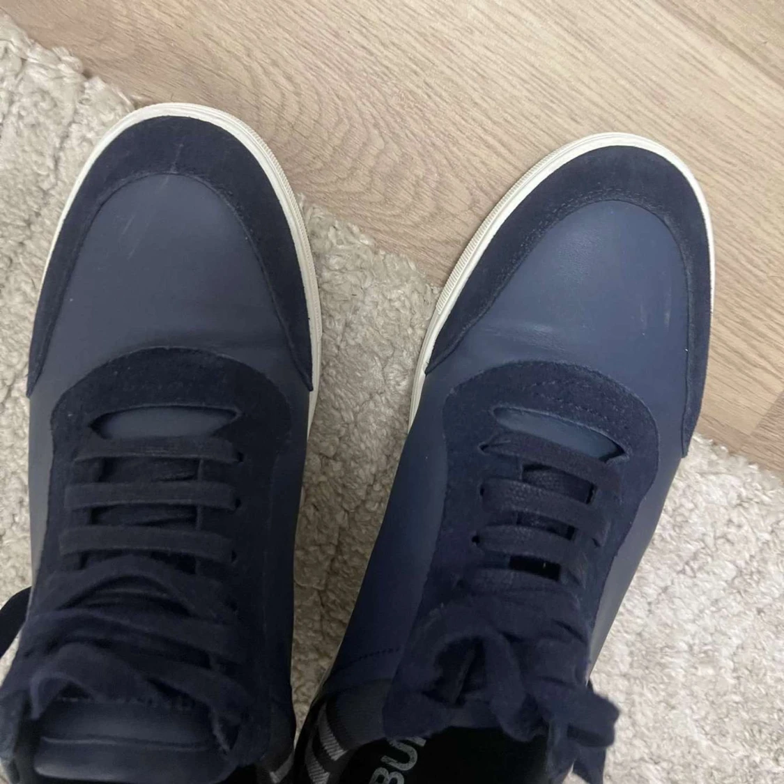 Snygga blå sneakers från Burberry med klassiskt rutigt mönster på sidorna. Skorna har en vit sula och snörning framtill. Perfekta för en stilren look. Skorna är i nytt skick använda 5 gånger typ .