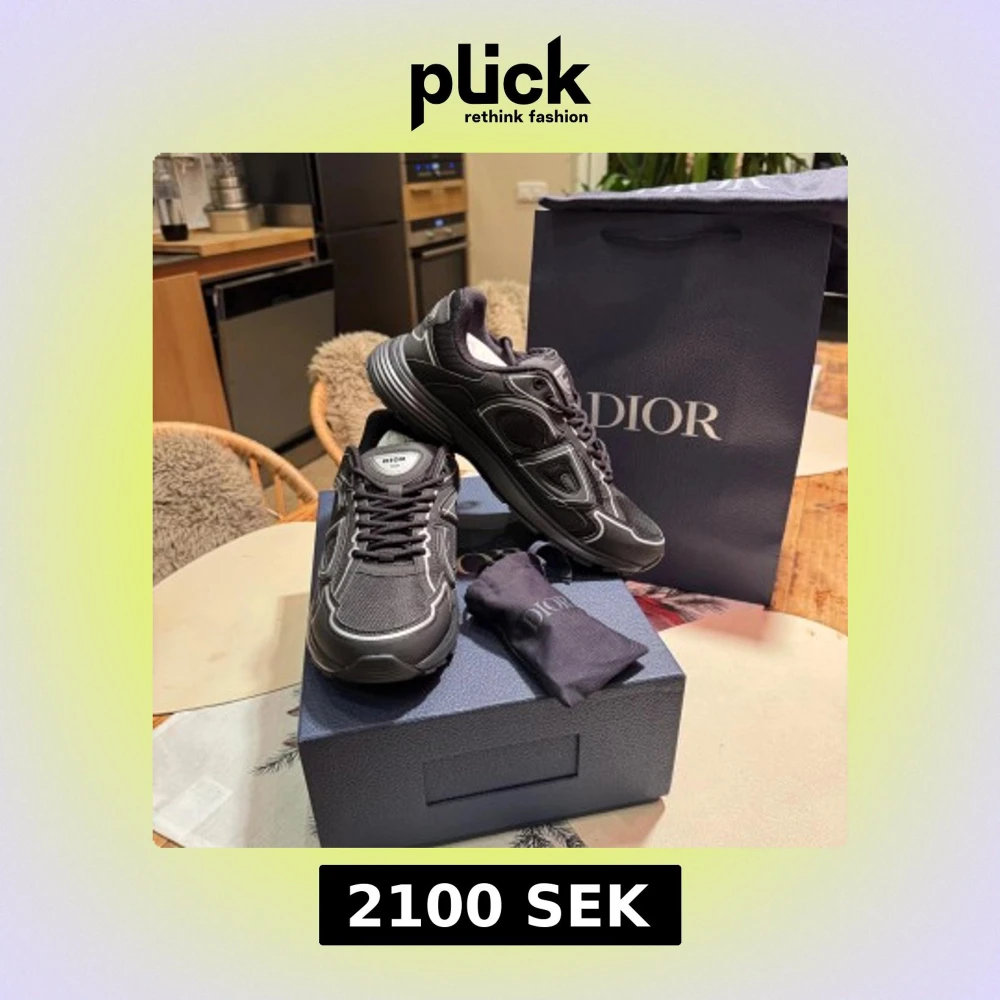 Säljer ett par svarta Dior B30 sneakers med coola vita detaljer och reflekterande inslag. Skorna har en chunky sula, mesh och syntetpaneler, samt snörning framtill. Märkets logga syns på sidan och plösen. Perfekt för dig som gillar exklusiv streetstyle. Säljer då dem vart för små för mig.