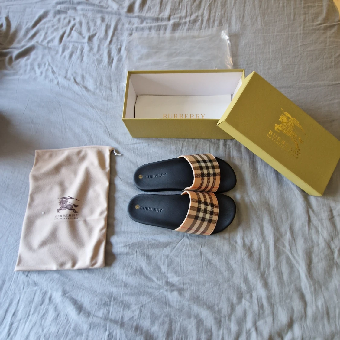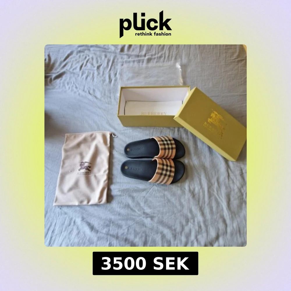 Snygga Burberry sandaler med klassiskt rutigt mönster i beige, svart och rött på remmen. Sulan är svart och har Burberry-logga. Perfekt för sommaren och chill dagar. Kommer med originalkartong och dustbag.