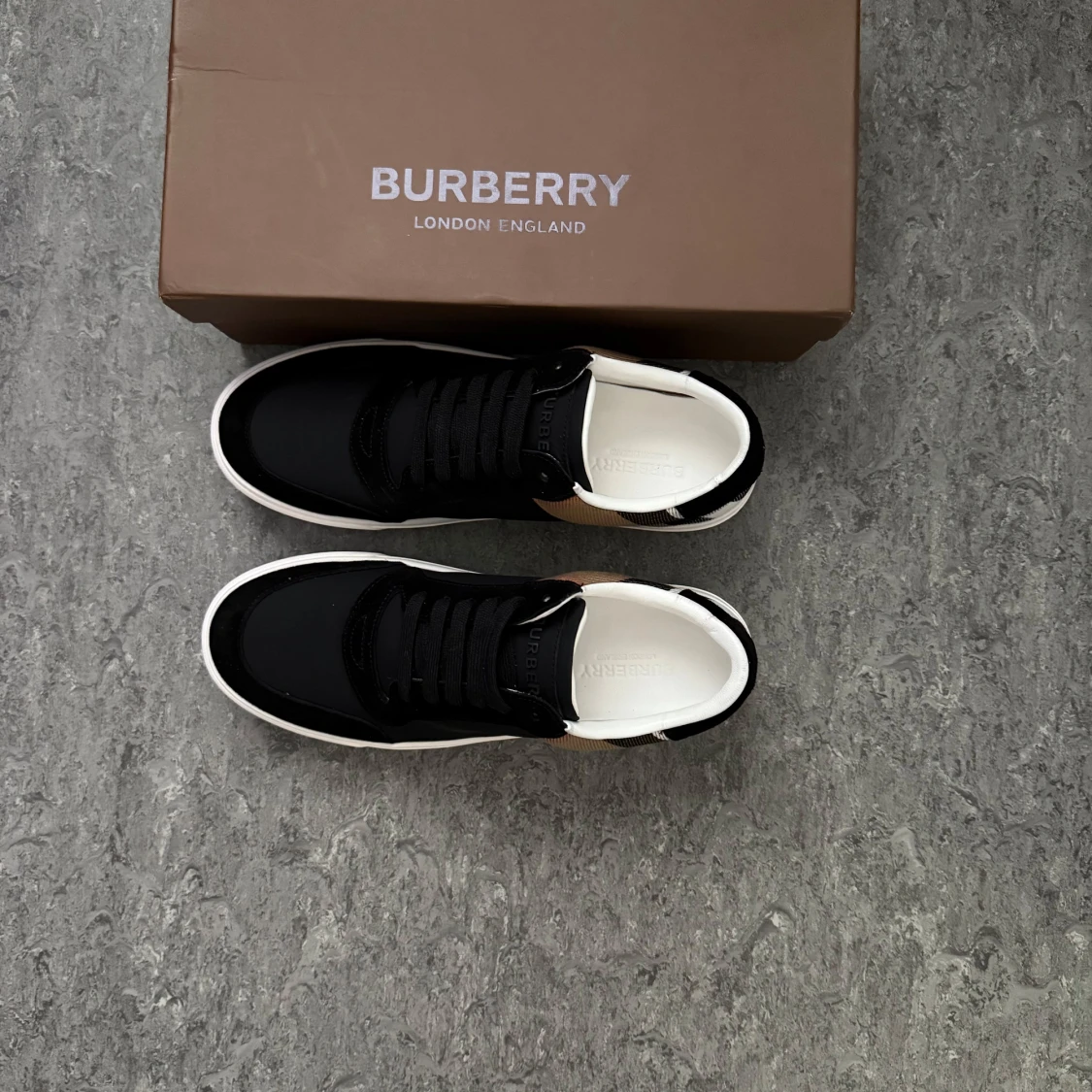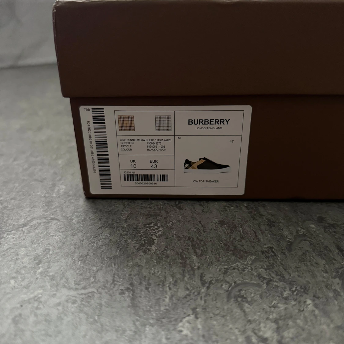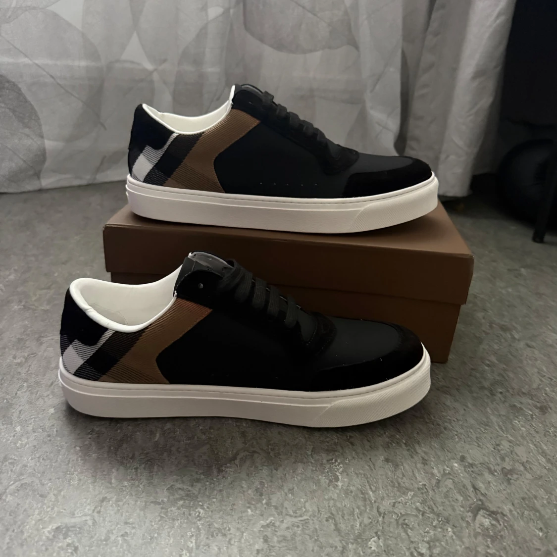 Snygga svarta sneakers från Burberry med klassiskt rutigt mönster i beige, svart och vitt på hälen. Skorna är nästan helt oanvända på grund av att de passar inte mig. Pris kan diskuteras! Vid fler frågor eller funderingar så är det bara att höra av sig!😄