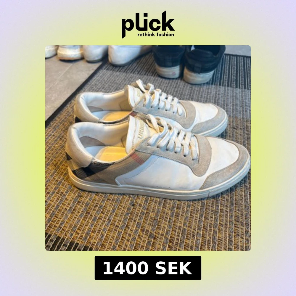 Snygga sneakers från Burberry i vitt skinn och grå mocka med klassiskt rutigt mönster på sidorna. Skorna har snörning och rund tå, samt diskret Burberry-logga på plösen. Perfekta för dig som vill ha en stilren men ändå unik look. Pris sitter inte fast i sten😁