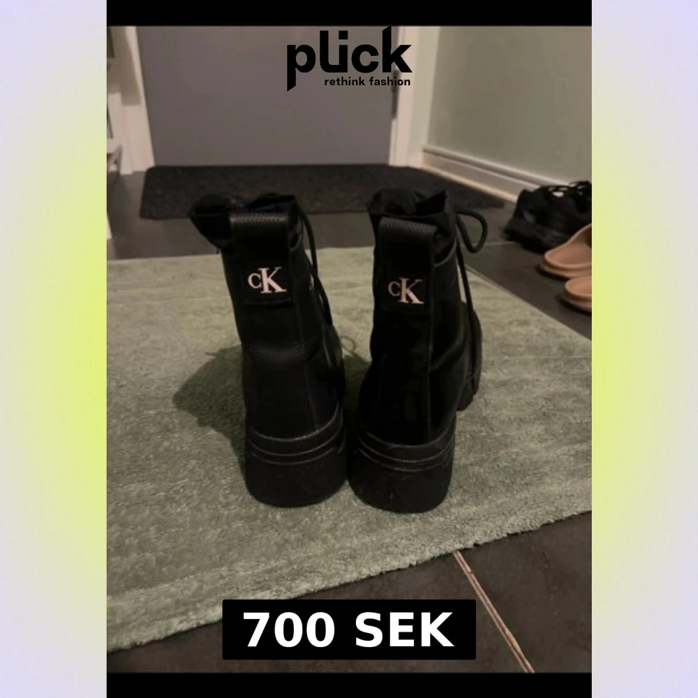 Säljer ett par svarta boots från Calvin Klein Jeans med grov platt sula och snörning framtill. Skorna har CK-logga på hälen och Calvin Klein Jeans-tryck på sidan. Materialet är en mix av skinn och syntet, med rund tå och robust design. Sparsamt använda