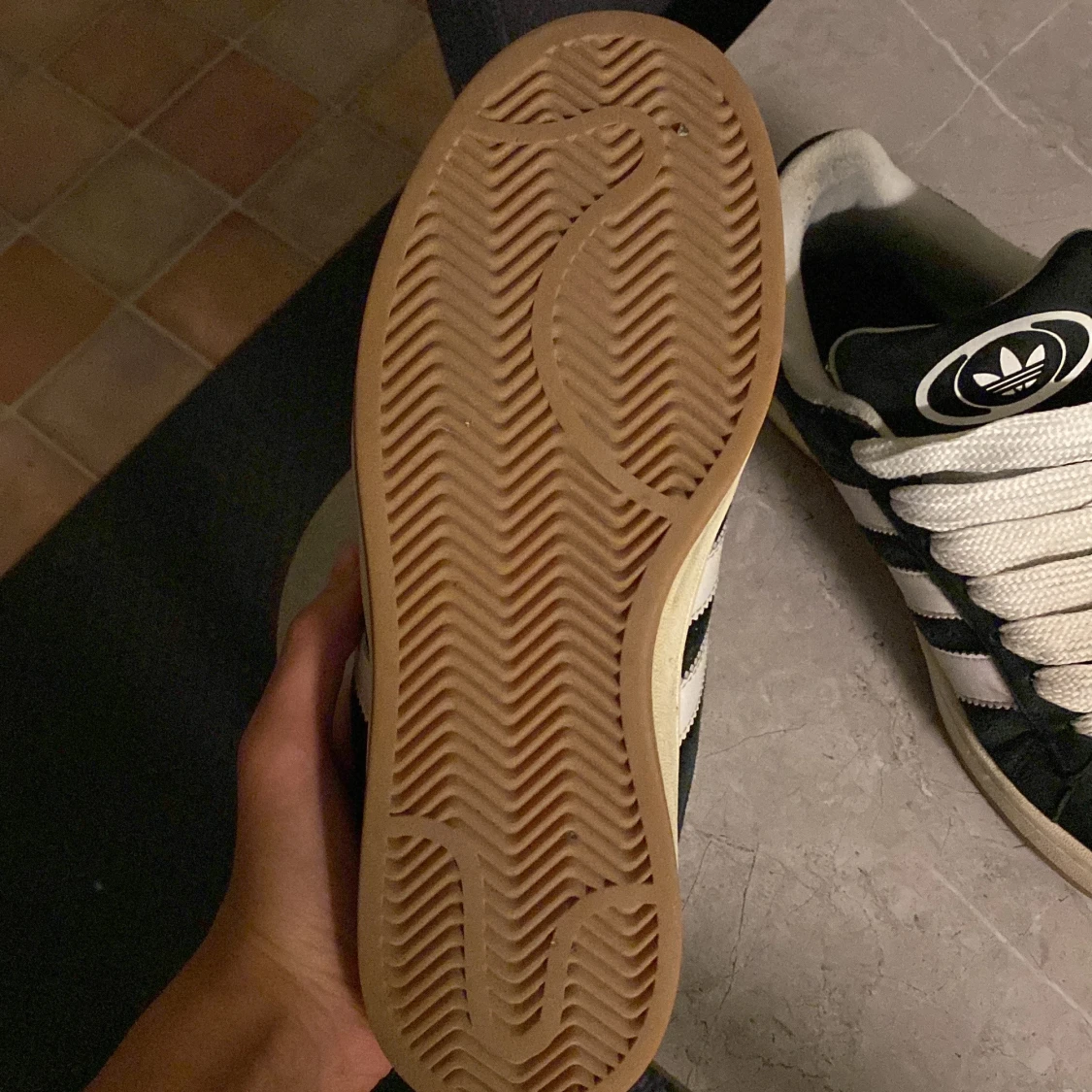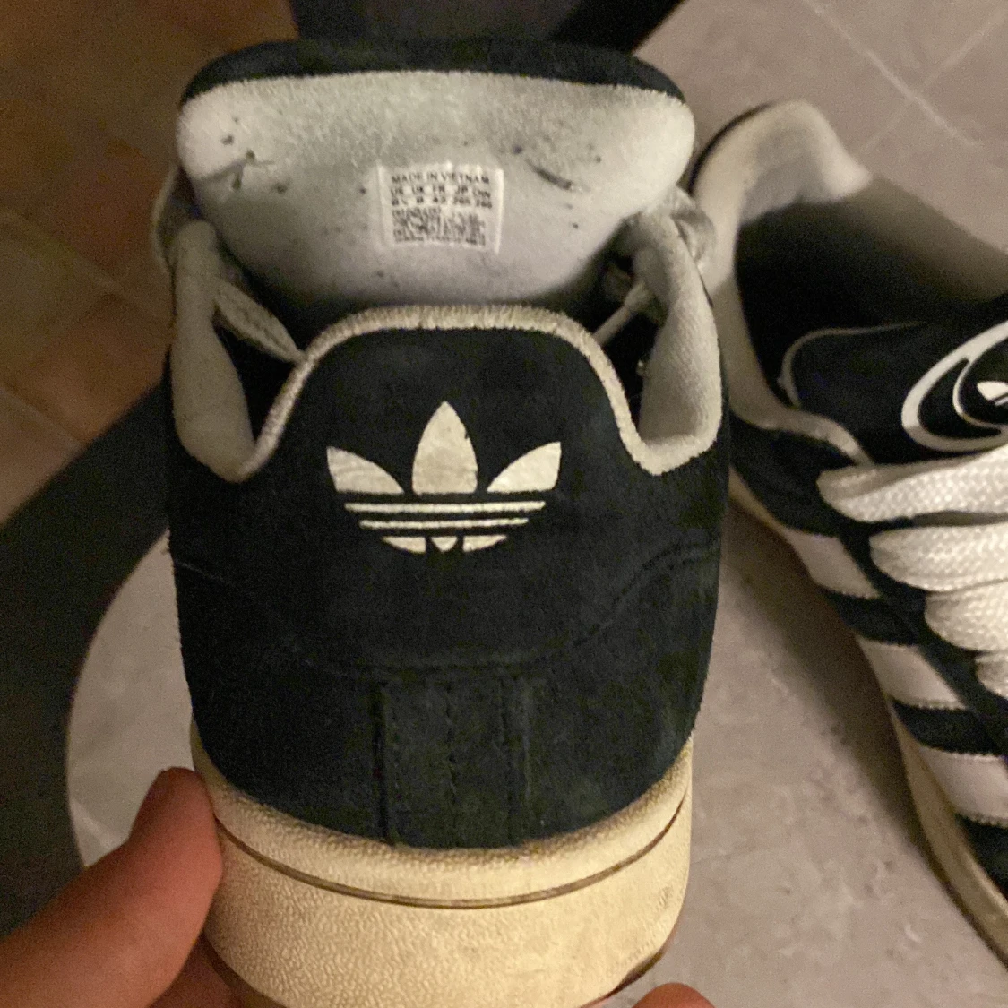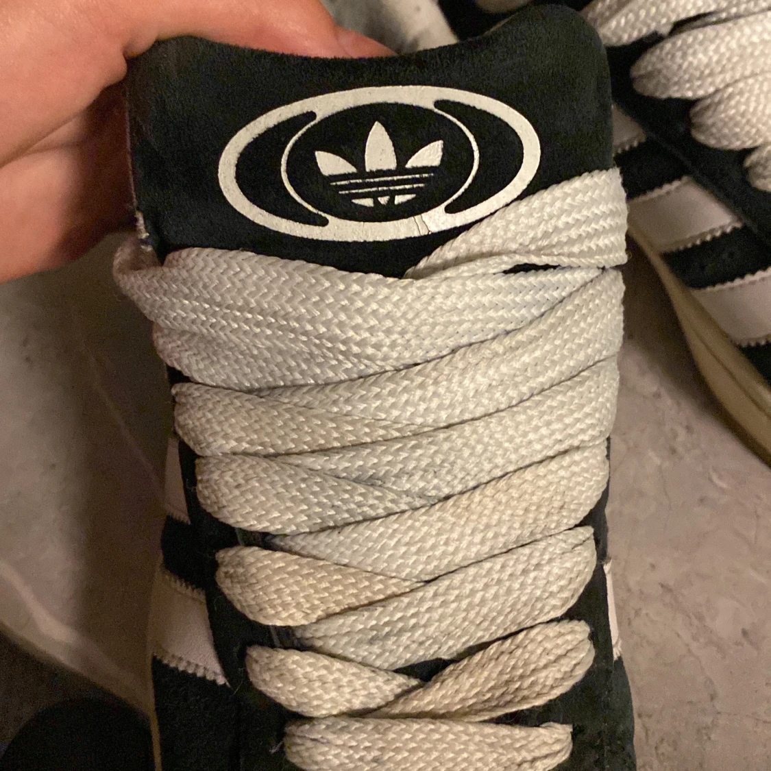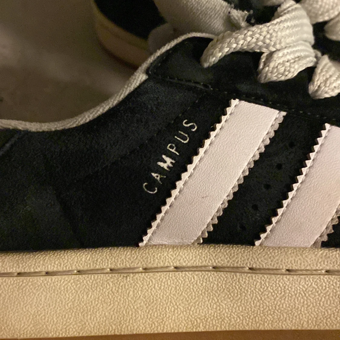 Säljer ett par klassiska svarta Adidas Campus sneakers med vita detaljer och snörning. Skorna har den ikoniska trefoil-loggan och tre ränder på sidan. Perfekta för en stilren look.